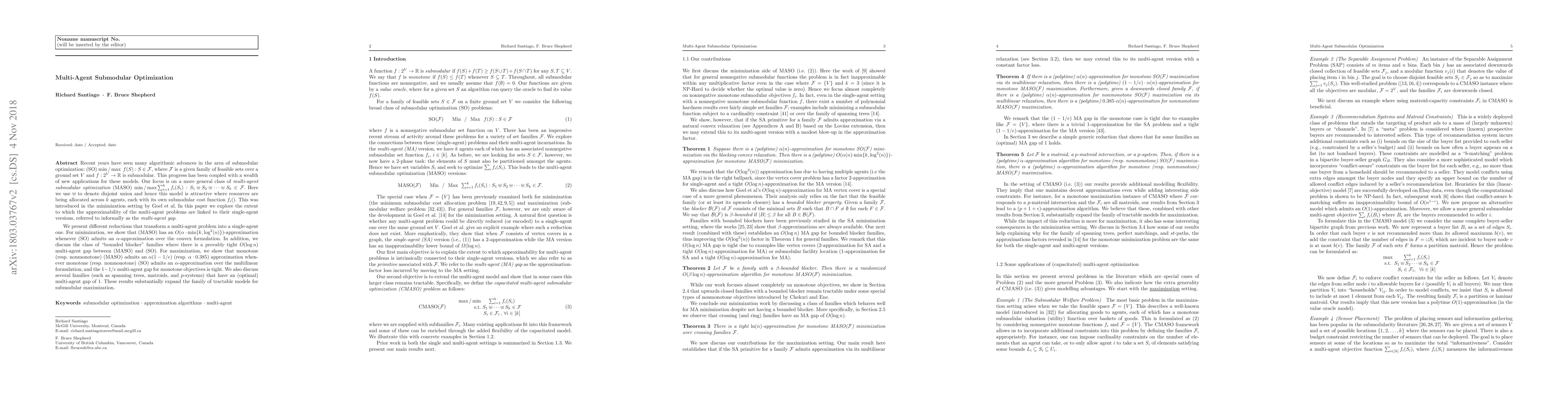 This paper explores multi-agent submodular optimization (MASO) and its approximability relative to single-agent submodular optimization (SO). The authors present reductions to show that MASO can be approximated efficiently when SO can, expanding the range of tractable models and discussing specific classes like spanning trees and matroids with a gap of 1.