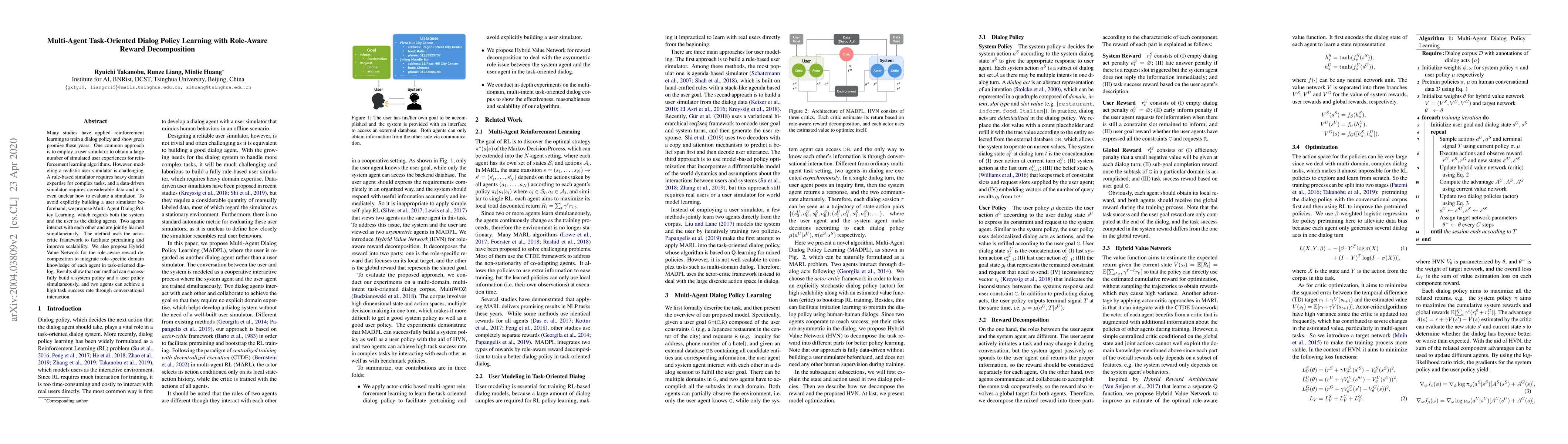 This paper proposes a Multi-Agent Dialog Policy Learning approach that jointly trains a system and user policy without requiring a pre-built user simulator. It uses an actor-critic framework and a Hybrid Value Network for role-aware reward decomposition, achieving high task success rates through conversational interaction.