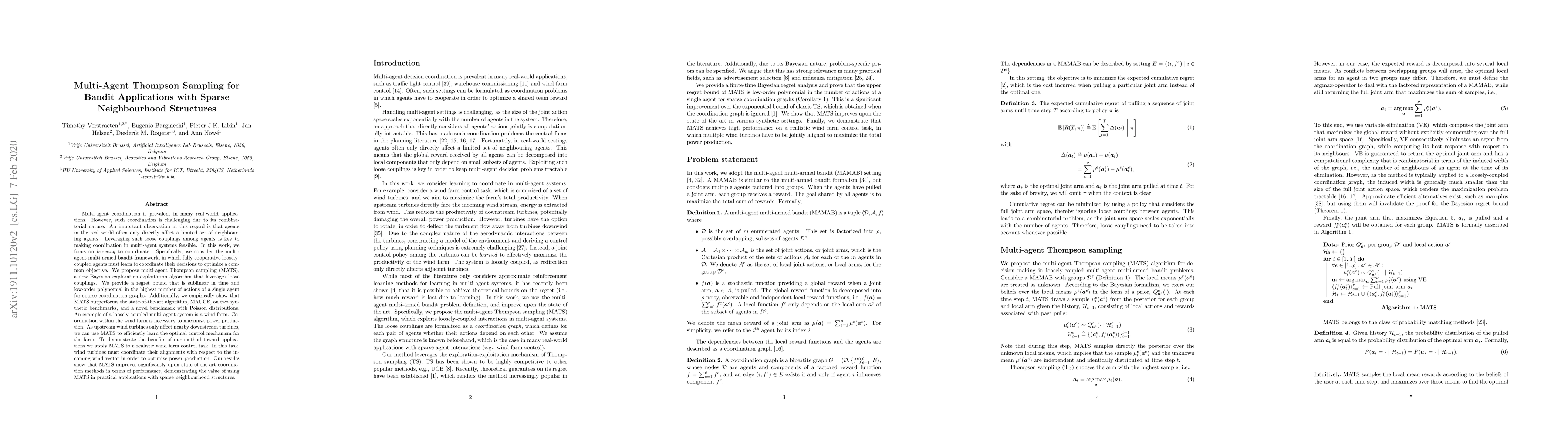 Multi-agent coordination is prevalent in many real-world applications. However, such coordination is challenging due to its combinatorial nature. An important observation in this regard is that agents in the real world often only directly affect a limited set of neighbouring agents. Leveraging such loose couplings among agents is key to making coordination in multi-agent systems feasible. In this work, we focus on learning to coordinate. Specifically, we consider the multi-agent multi-armed bandit framework, in which fully cooperative loosely-coupled agents must learn to coordinate their decisions to optimize a common objective. We propose multi-agent Thompson sampling (MATS), a new Bayesian exploration-exploitation algorithm that leverages loose couplings. We provide a regret bound that is sublinear in time and low-order polynomial in the highest number of actions of a single agent for sparse coordination graphs. Additionally, we empirically show that MATS outperforms the state-of-the-art algorithm, MAUCE, on two synthetic benchmarks, and a novel benchmark with Poisson distributions. An example of a loosely-coupled multi-agent system is a wind farm. Coordination within the wind farm is necessary to maximize power production. As upstream wind turbines only affect nearby downstream turbines, we can use MATS to efficiently learn the optimal control mechanism for the farm. To demonstrate the benefits of our method toward applications we apply MATS to a realistic wind farm control task. In this task, wind turbines must coordinate their alignments with respect to the incoming wind vector in order to optimize power production. Our results show that MATS improves significantly upon state-of-the-art coordination methods in terms of performance, demonstrating the value of using MATS in practical applications with sparse neighbourhood structures.
