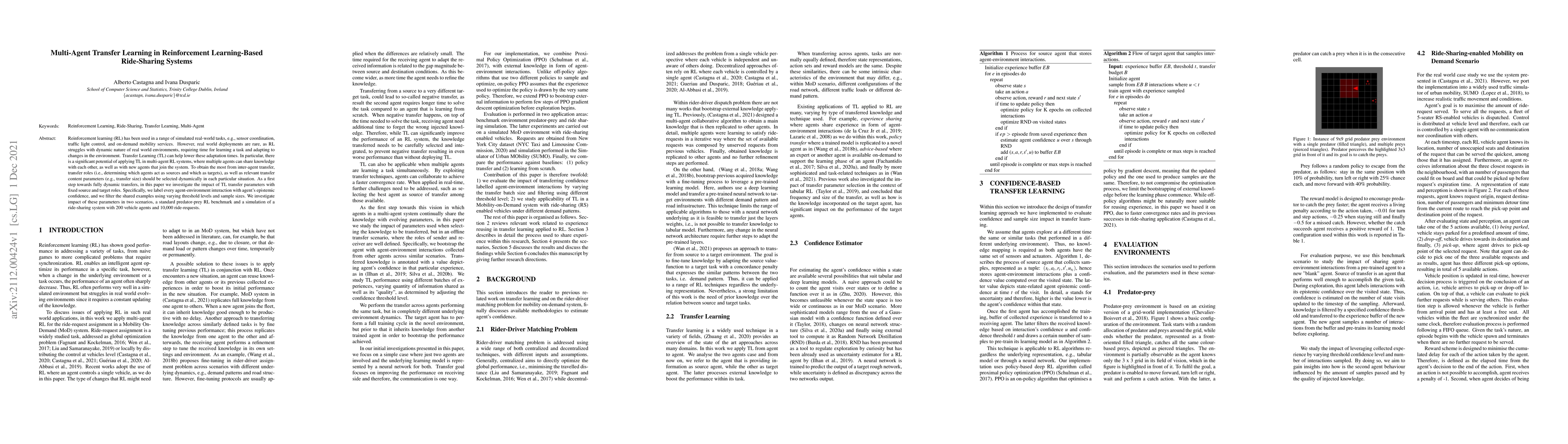 This paper explores the application of Transfer Learning (TL) in multi-agent reinforcement learning (RL) systems, specifically focusing on ride-sharing scenarios. It investigates the impact of TL parameters like confidence thresholds and sample sizes on agent performance, comparing results in a predator-prey RL benchmark and a simulated ride-sharing system.