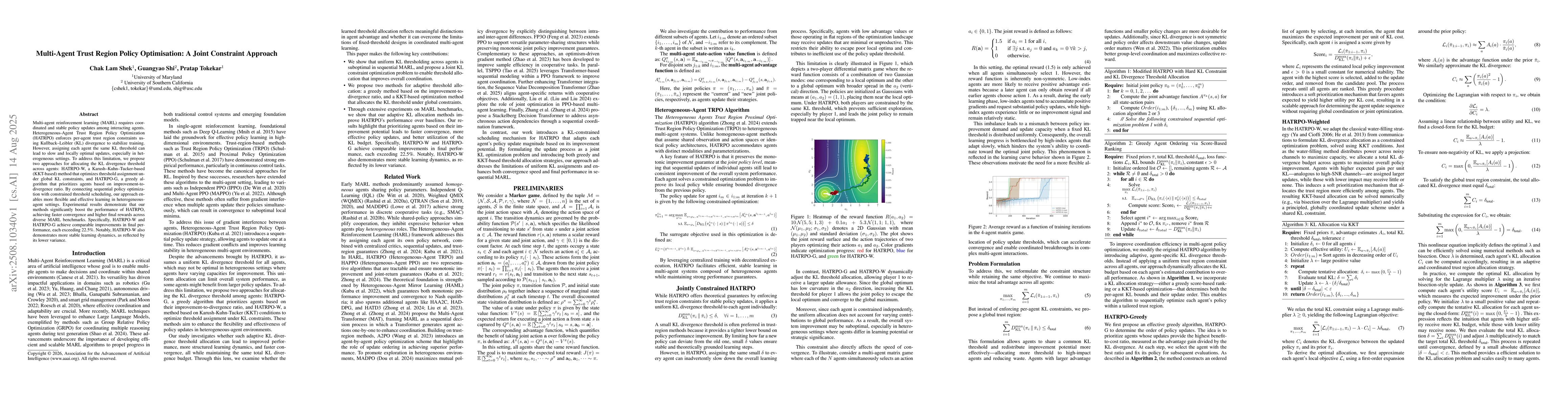 Multi-agent reinforcement learning (MARL) requires coordinated and stable policy updates among interacting agents. Heterogeneous-Agent Trust Region Policy Optimization (HATRPO) enforces per-agent trust region constraints using Kullback-Leibler (KL) divergence to stabilize training. However, assigning each agent the same KL threshold can lead to slow and locally optimal updates, especially in heterogeneous settings. To address this limitation, we propose two approaches for allocating the KL divergence threshold across agents: HATRPO-W, a Karush-Kuhn-Tucker-based (KKT-based) method that optimizes threshold assignment under global KL constraints, and HATRPO-G, a greedy algorithm that prioritizes agents based on improvement-to-divergence ratio. By connecting sequential policy optimization with constrained threshold scheduling, our approach enables more flexible and effective learning in heterogeneous-agent settings. Experimental results demonstrate that our methods significantly boost the performance of HATRPO, achieving faster convergence and higher final rewards across diverse MARL benchmarks. Specifically, HATRPO-W and HATRPO-G achieve comparable improvements in final performance, each exceeding 22.5%. Notably, HATRPO-W also demonstrates more stable learning dynamics, as reflected by its lower variance.