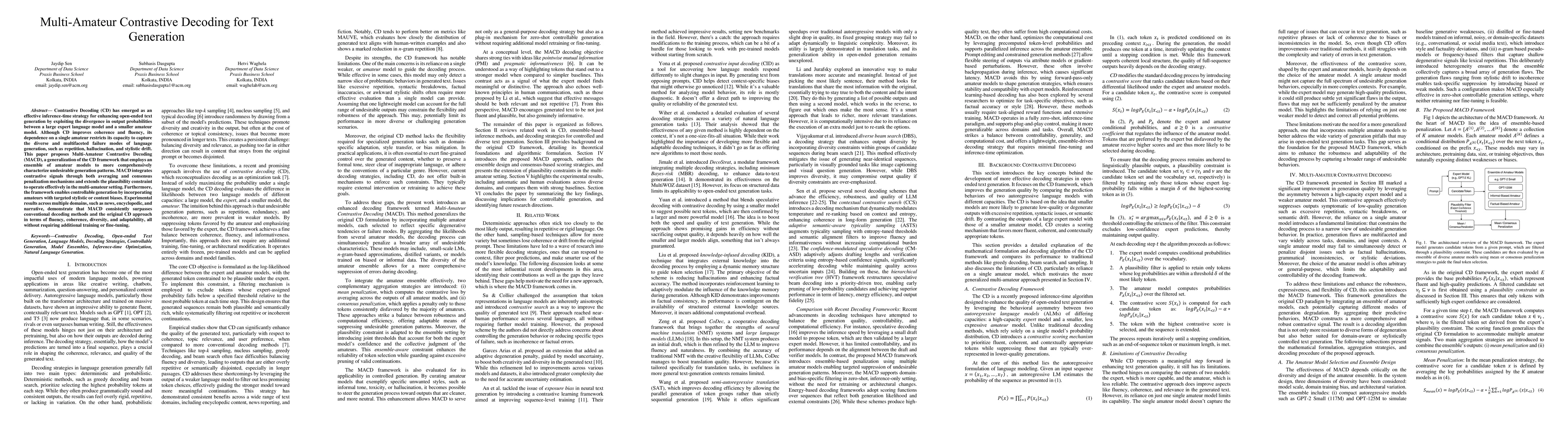Contrastive Decoding (CD) has emerged as an effective inference-time strategy for enhancing open-ended text generation by exploiting the divergence in output probabilities between a large expert language model and a smaller amateur model. Although CD improves coherence and fluency, its dependence on a single amateur restricts its capacity to capture the diverse and multifaceted failure modes of language generation, such as repetition, hallucination, and stylistic drift. This paper proposes Multi-Amateur Contrastive Decoding (MACD), a generalization of the CD framework that employs an ensemble of amateur models to more comprehensively characterize undesirable generation patterns. MACD integrates contrastive signals through both averaging and consensus penalization mechanisms and extends the plausibility constraint to operate effectively in the multi-amateur setting. Furthermore, the framework enables controllable generation by incorporating amateurs with targeted stylistic or content biases. Experimental results across multiple domains, such as news, encyclopedic, and narrative, demonstrate that MACD consistently surpasses conventional decoding methods and the original CD approach in terms of fluency, coherence, diversity, and adaptability, all without requiring additional training or fine-tuning.