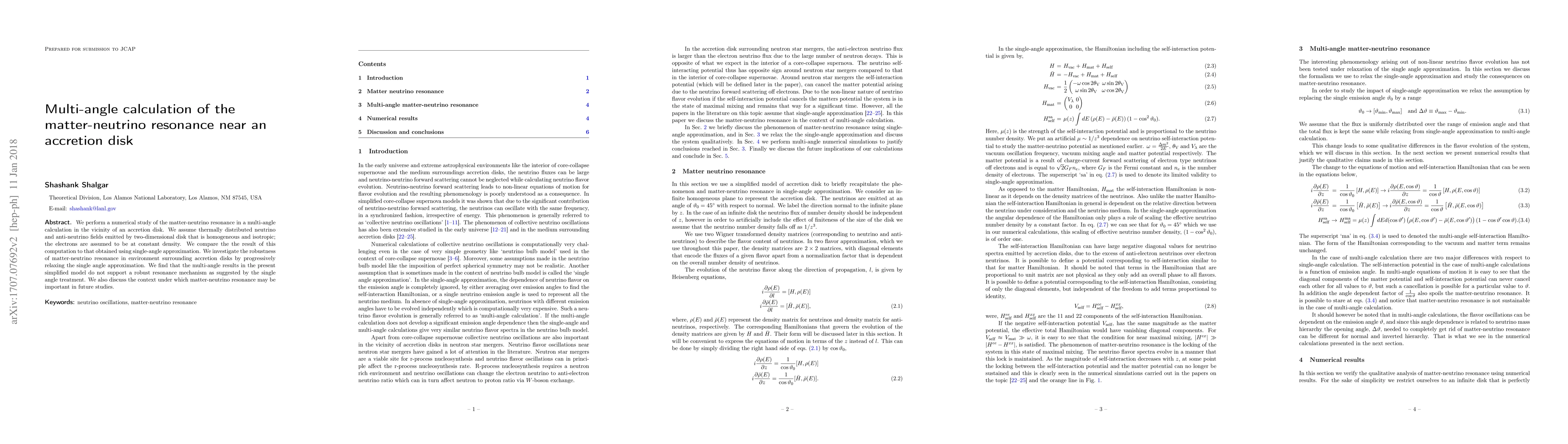 We perform a numerical study of the matter-neutrino resonance in a multi-angle calculation in the vicinity of an accretion disk. We assume thermally distributed neutrino and anti-neutrino fields emitted by two-dimensional disk that is homogeneous and isotropic; the electrons are assumed to be at constant density. We compare the the result of this computation to that obtained using single-angle approximation. We investigate the robustness of matter-neutrino resonance in environment surrounding accretion disks by progressively relaxing the single angle approximation. We find that the multi-angle results in the present simplified model do not support a robust resonance mechanism as suggested by the single angle treatment. We also discuss the context under which matter-neutrino resonance may be important in future studies.