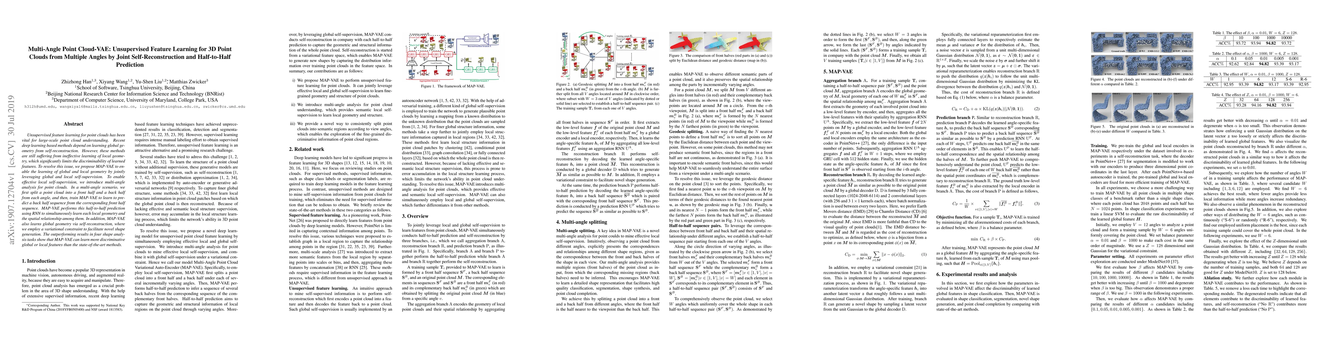 Unsupervised feature learning for point clouds has been vital for large-scale point cloud understanding. Recent deep learning based methods depend on learning global geometry from self-reconstruction. However, these methods are still suffering from ineffective learning of local geometry, which significantly limits the discriminability of learned features. To resolve this issue, we propose MAP-VAE to enable the learning of global and local geometry by jointly leveraging global and local self-supervision. To enable effective local self-supervision, we introduce multi-angle analysis for point clouds. In a multi-angle scenario, we first split a point cloud into a front half and a back half from each angle, and then, train MAP-VAE to learn to predict a back half sequence from the corresponding front half sequence. MAP-VAE performs this half-to-half prediction using RNN to simultaneously learn each local geometry and the spatial relationship among them. In addition, MAP-VAE also learns global geometry via self-reconstruction, where we employ a variational constraint to facilitate novel shape generation. The outperforming results in four shape analysis tasks show that MAP-VAE can learn more discriminative global or local features than the state-of-the-art methods.