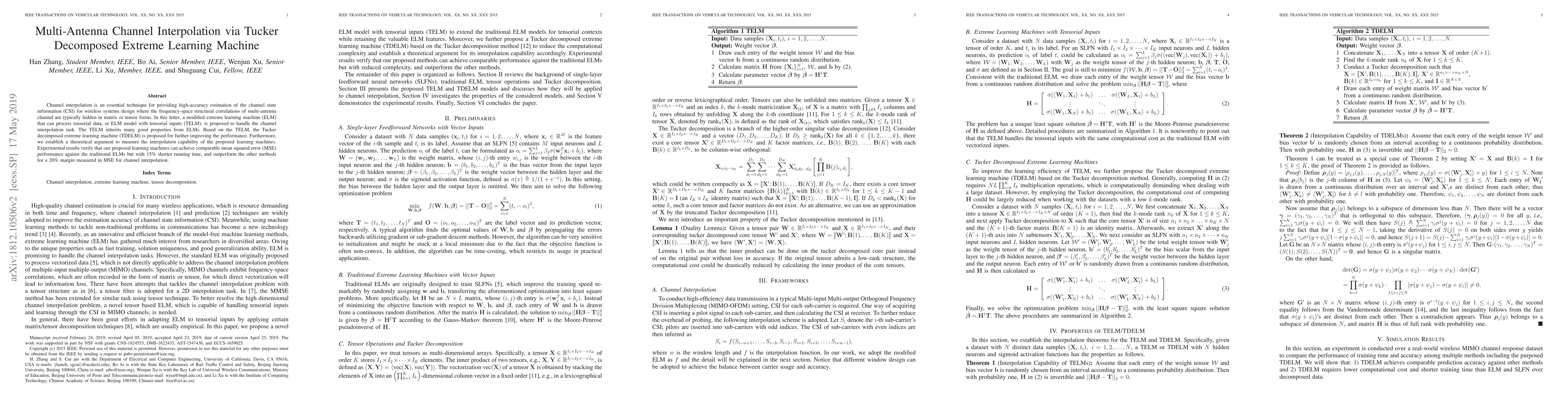 This paper proposes a modified extreme learning machine (TELM) for tensorial data, specifically for multi-antenna channel interpolation. The Tucker decomposed extreme learning machine (TDELM) further enhances performance, achieving comparable mean squared error (MSE) but with 15% shorter running time and a 20% MSE improvement over other methods.