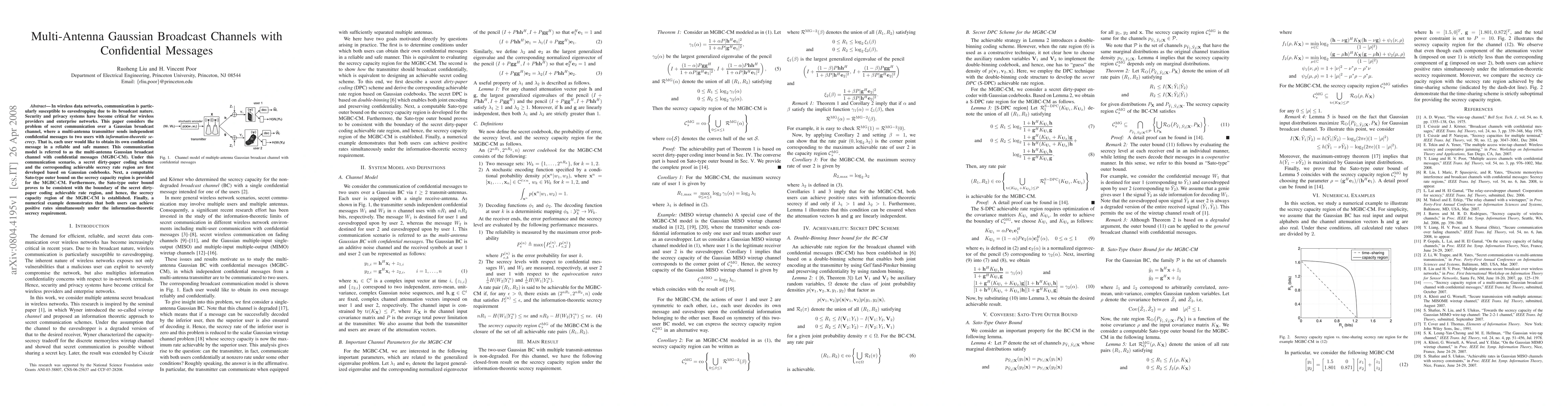 This paper develops a secret communication scheme for a multi-antenna Gaussian broadcast channel with confidential messages, establishing an achievable secrecy rate region and a computable outer bound that confirms the secrecy capacity. Numerical results show both users can achieve positive rates under information-theoretic secrecy.