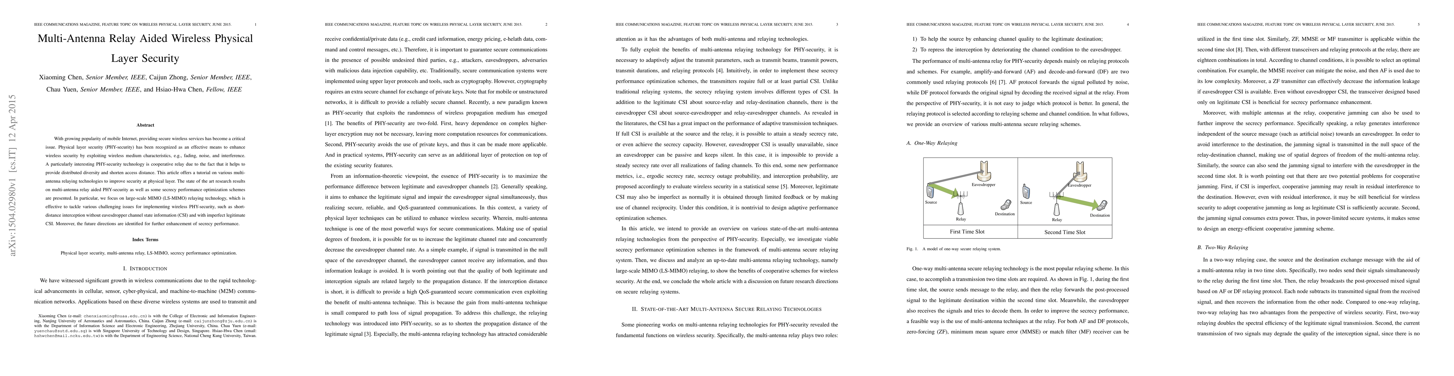 This paper reviews multi-antenna relay-aided physical layer security techniques, emphasizing large-scale MIMO relaying to enhance wireless security. It discusses state-of-the-art research and optimization schemes for secrecy performance, particularly under conditions of imperfect channel state information.