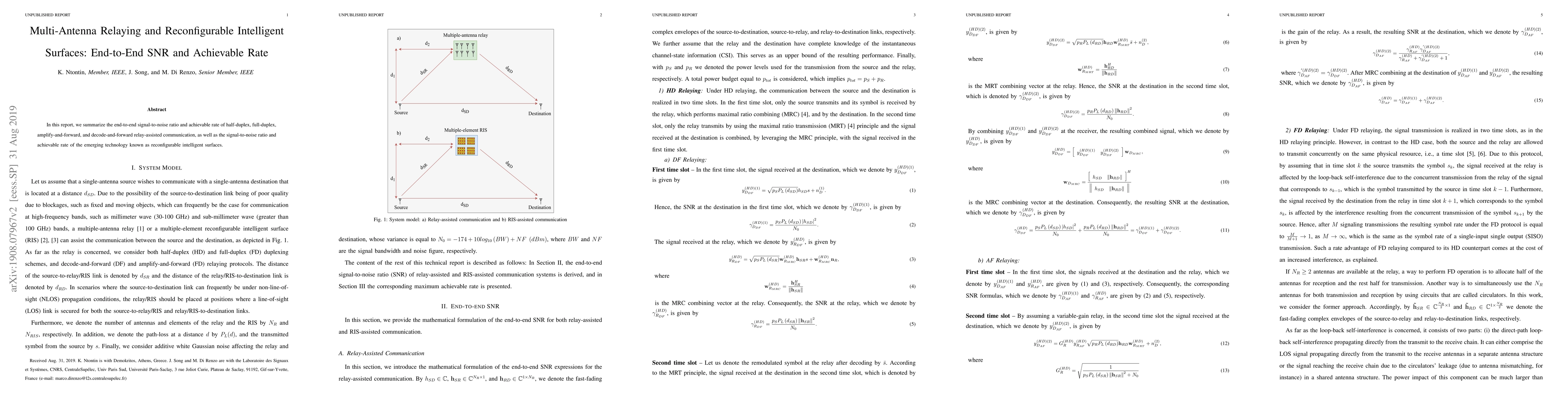 In this report, we summarize the end-to-end signal-to-noise ratio and the rate of half-duplex, full-duplex, amplify-and-forward, and decode-and-forward relay-aided communications, and well as the signal-to-noise ratio and the rate of the emerging technology known as reconfigurable intelligent surfaces.