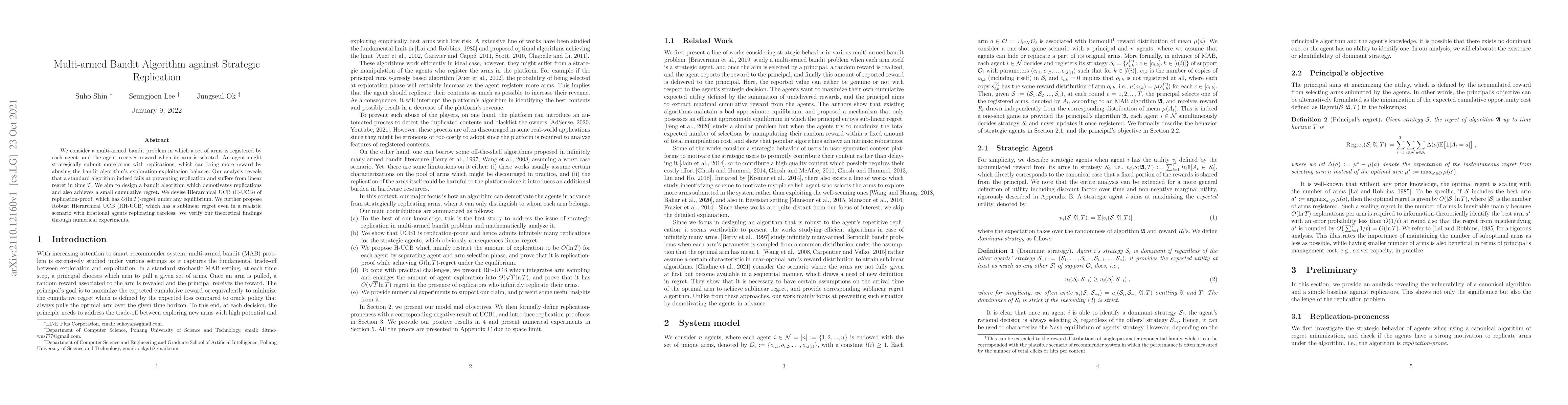 This paper addresses the multi-armed bandit problem where agents can strategically replicate arms to exploit the algorithm's balance. It introduces a replication-proof Hierarchical UCB (H-UCB) algorithm achieving $O(\ln T)$-regret and a Robust Hierarchical UCB (RH-UCB) for sublinear regret even with irrational agents, validated through numerical experiments.