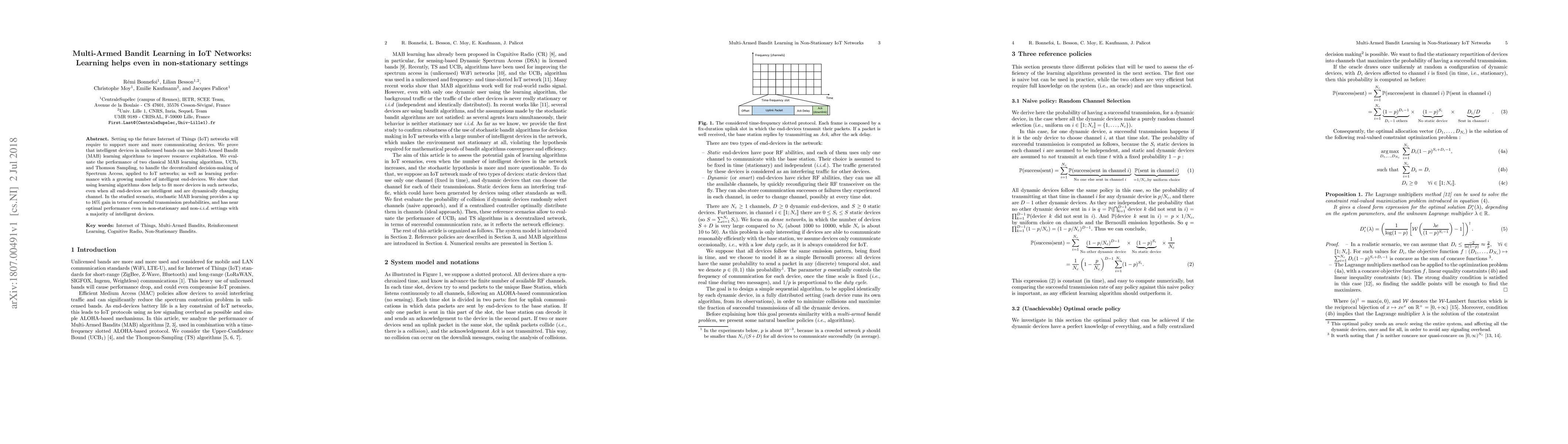 Setting up the future Internet of Things (IoT) networks will require to support more and more communicating devices. We prove that intelligent devices in unlicensed bands can use Multi-Armed Bandit (MAB) learning algorithms to improve resource exploitation. We evaluate the performance of two classical MAB learning algorithms, UCB1 and Thompson Sampling, to handle the decentralized decision-making of Spectrum Access, applied to IoT networks; as well as learning performance with a growing number of intelligent end-devices. We show that using learning algorithms does help to fit more devices in such networks, even when all end-devices are intelligent and are dynamically changing channel. In the studied scenario, stochastic MAB learning provides a up to 16% gain in term of successful transmission probabilities, and has near optimal performance even in non-stationary and non-i.i.d. settings with a majority of intelligent devices.