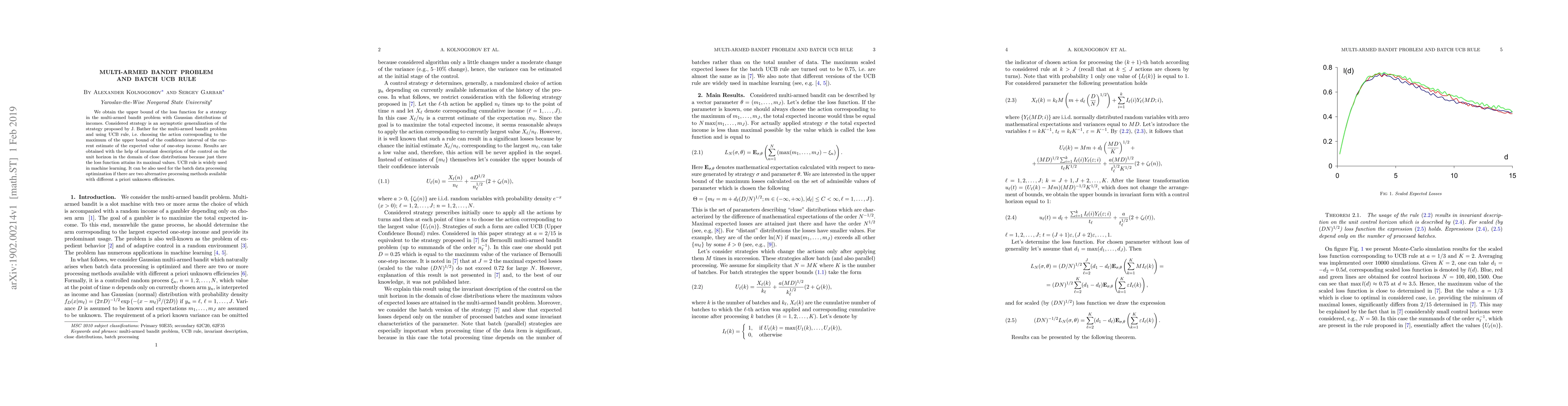 This paper investigates the multi-armed bandit problem with Gaussian income distributions, proposing an asymptotic generalization of the UCB rule to optimize batch data processing. The batch UCB rule selects the best action based on the maximum confidence interval upper bound, achieving optimal loss bounds through invariant control descriptions.
