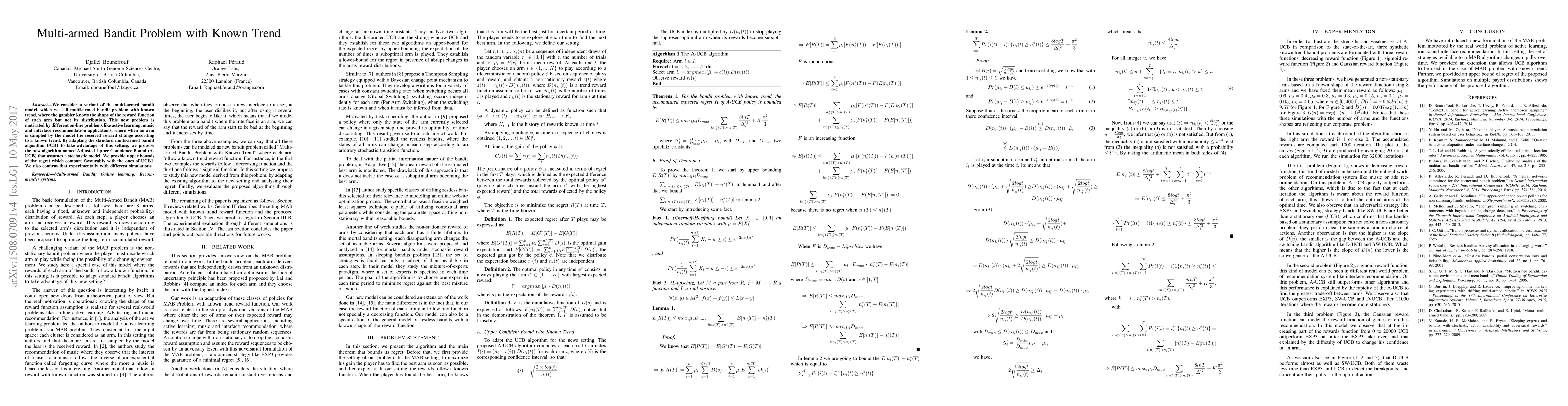 This paper introduces a variant of the multi-armed bandit problem called the multi-armed bandit with known trend, where reward functions follow a known trend but not a known distribution. The authors propose a new algorithm, A-UCB, which adapts the standard UCB1 algorithm and provides upper bounds on regret that compare favorably to UCB1, confirmed by experimental simulations.