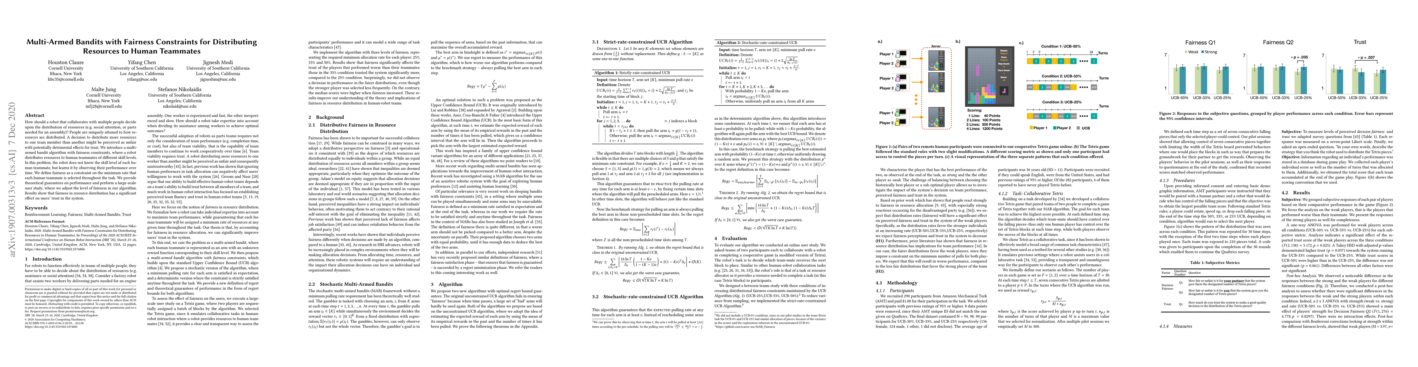 How should a robot that collaborates with multiple people decide upon the distribution of resources (e.g. social attention, or parts needed for an assembly)? People are uniquely attuned to how resources are distributed. A decision to distribute more resources to one team member than another might be perceived as unfair with potentially detrimental effects for trust. We introduce a multi-armed bandit algorithm with fairness constraints, where a robot distributes resources to human teammates of different skill levels. In this problem, the robot does not know the skill level of each human teammate, but learns it by observing their performance over time. We define fairness as a constraint on the minimum rate that each human teammate is selected throughout the task. We provide theoretical guarantees on performance and perform a large-scale user study, where we adjust the level of fairness in our algorithm. Results show that fairness in resource distribution has a significant effect on users' trust in the system.