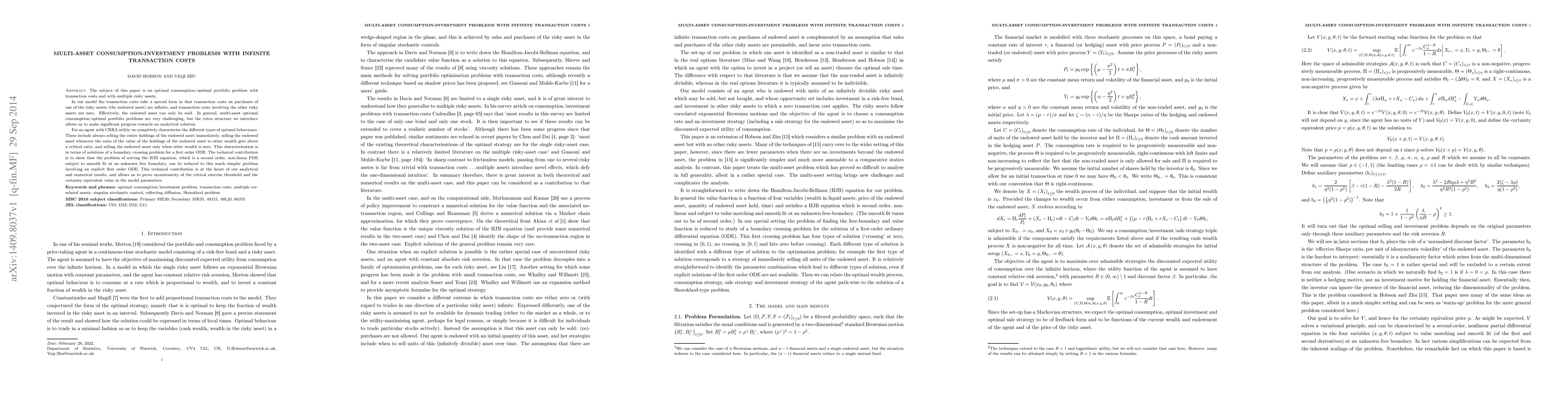 This paper addresses an optimal consumption/portfolio problem with infinite transaction costs for an endowed risky asset and zero costs for others, simplifying the multi-asset problem. It characterizes optimal behaviors and reduces the complex HJB equation to a simpler first-order ODE, proving monotonicity of critical thresholds.