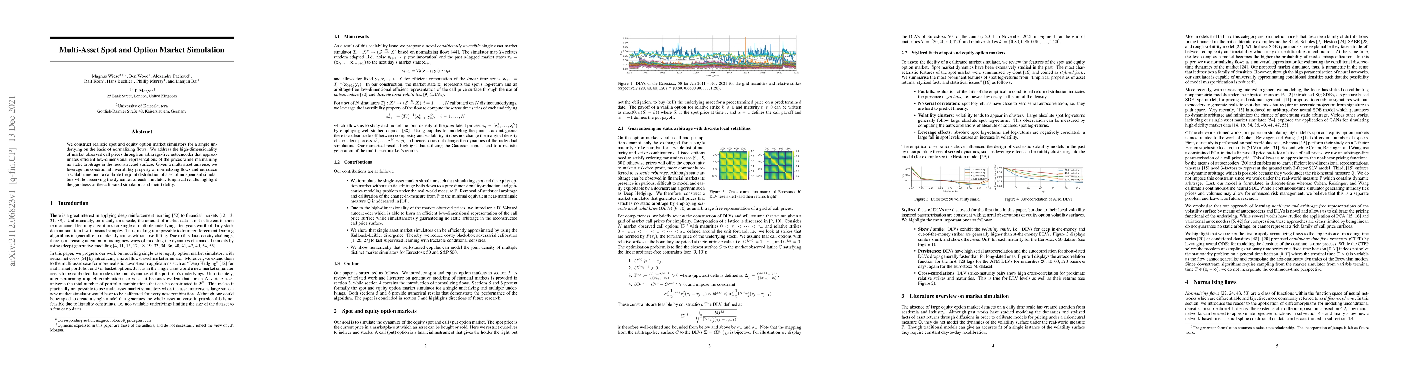 We construct realistic spot and equity option market simulators for a single underlying on the basis of normalizing flows. We address the high-dimensionality of market observed call prices through an arbitrage-free autoencoder that approximates efficient low-dimensional representations of the prices while maintaining no static arbitrage in the reconstructed surface. Given a multi-asset universe, we leverage the conditional invertibility property of normalizing flows and introduce a scalable method to calibrate the joint distribution of a set of independent simulators while preserving the dynamics of each simulator. Empirical results highlight the goodness of the calibrated simulators and their fidelity.