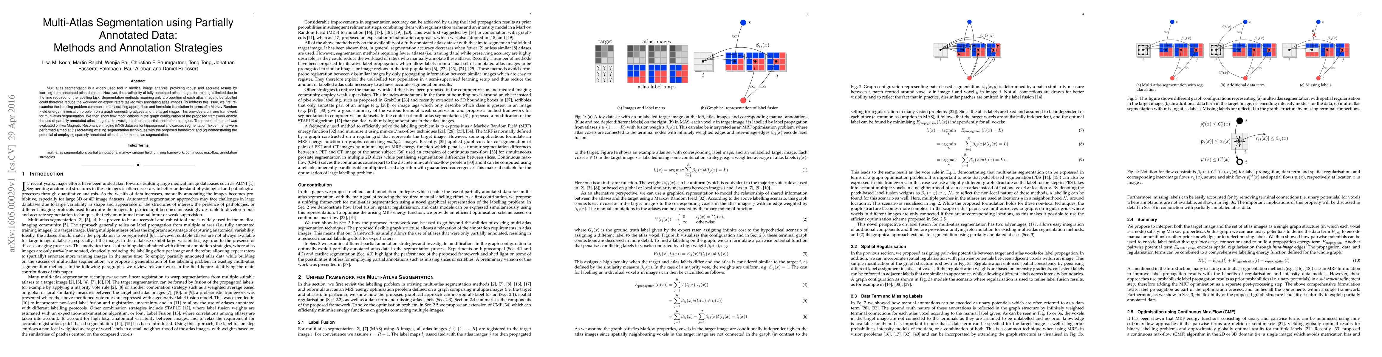 This paper proposes a framework for multi-atlas segmentation using partially annotated data, addressing the challenge of limited fully annotated atlas images. The method reformulates the labelling problem as a Markov Random Field energy minimisation, enabling the use of sparsely annotated atlas images and various annotation strategies, which was evaluated on MRI datasets for hippocampal and cardiac segmentation.