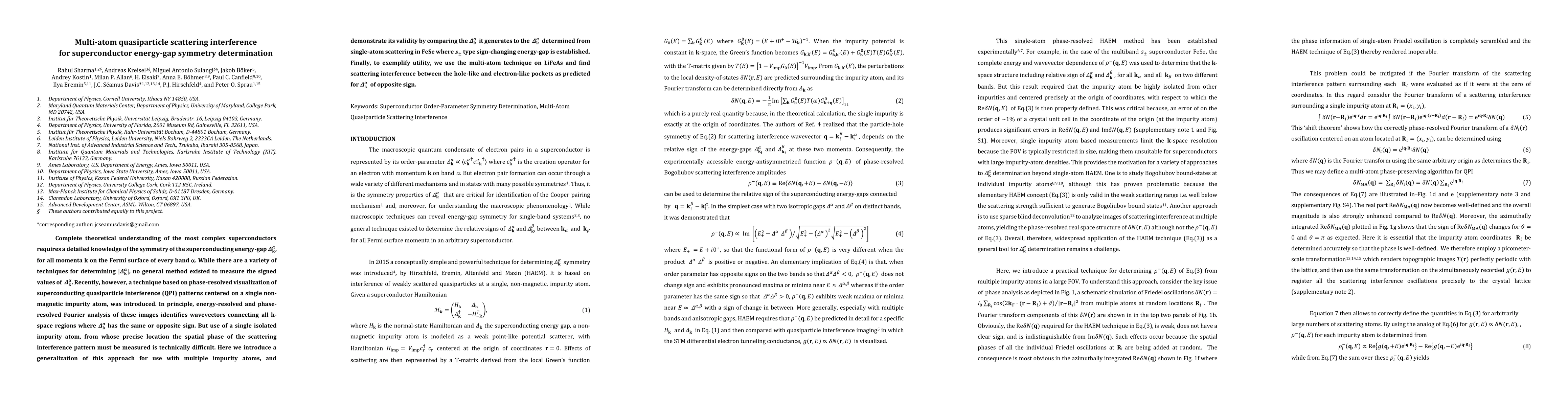 Complete theoretical understanding of the most complex superconductors requires a detailed knowledge of the symmetry of the superconducting energy-gap $\Delta_\mathbf{k}^\alpha$, for all momenta $\mathbf{k}$ on the Fermi surface of every band $\alpha$. While there are a variety of techniques for determining $|\Delta_\mathbf{k}^\alpha|$, no general method existed to measure the signed values of $\Delta_\mathbf{k}^\alpha$. Recently, however, a new technique based on phase-resolved visualization of superconducting quasiparticle interference (QPI) patterns centered on a single non-magnetic impurity atom, was introduced. In principle, energy-resolved and phase-resolved Fourier analysis of these images identifies wavevectors connecting all k-space regions where $\Delta_\mathbf{k}^\alpha$ has the same or opposite sign. But use of a single isolated impurity atom, from whose precise location the spatial phase of the scattering interference pattern must be measured is technically difficult. Here we introduce a generalization of this approach for use with multiple impurity atoms, and demonstrate its validity by comparing the $\Delta_\mathbf{k}^\alpha$ it generates to the $\Delta_\mathbf{k}^\alpha$ determined from single-atom scattering in FeSe where $s_{\pm}$ energy-gap symmetry is established. Finally, to exemplify utility, we use the multi-atom technique on LiFeAs and find scattering interference between the hole-like and electron-like pockets as predicted for $\Delta_\mathbf{k}^\alpha$ of opposite sign.