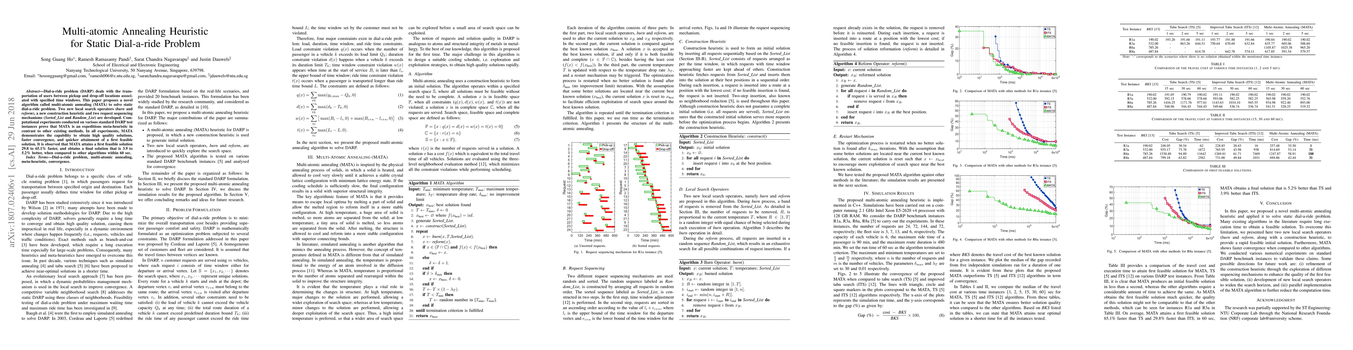 This paper introduces a multi-atomic annealing heuristic (MATA) for solving the static dial-a-ride problem, featuring new local search operators and sequencing mechanisms. Computational experiments show MATA achieves faster convergence and higher quality solutions compared to existing methods.