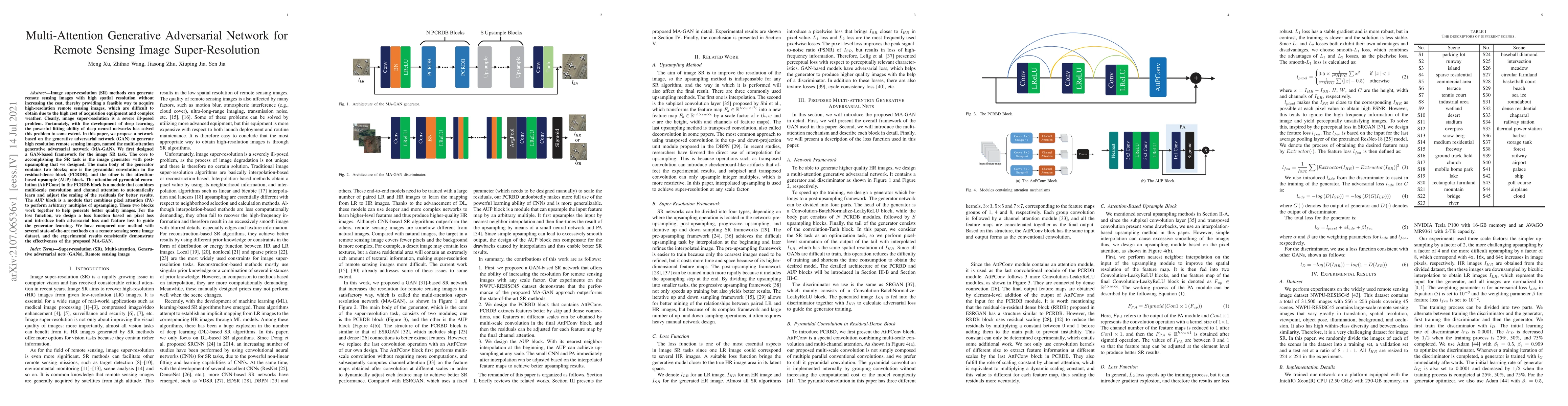 This paper proposes a multi-attention generative adversarial network (MA-GAN) for remote sensing image super-resolution, utilizing a generator with pyramidal convolution in the residual-dense block and an attention-based upsample block to enhance image resolution. The method demonstrates superior performance compared to state-of-the-art techniques on a remote sensing dataset.