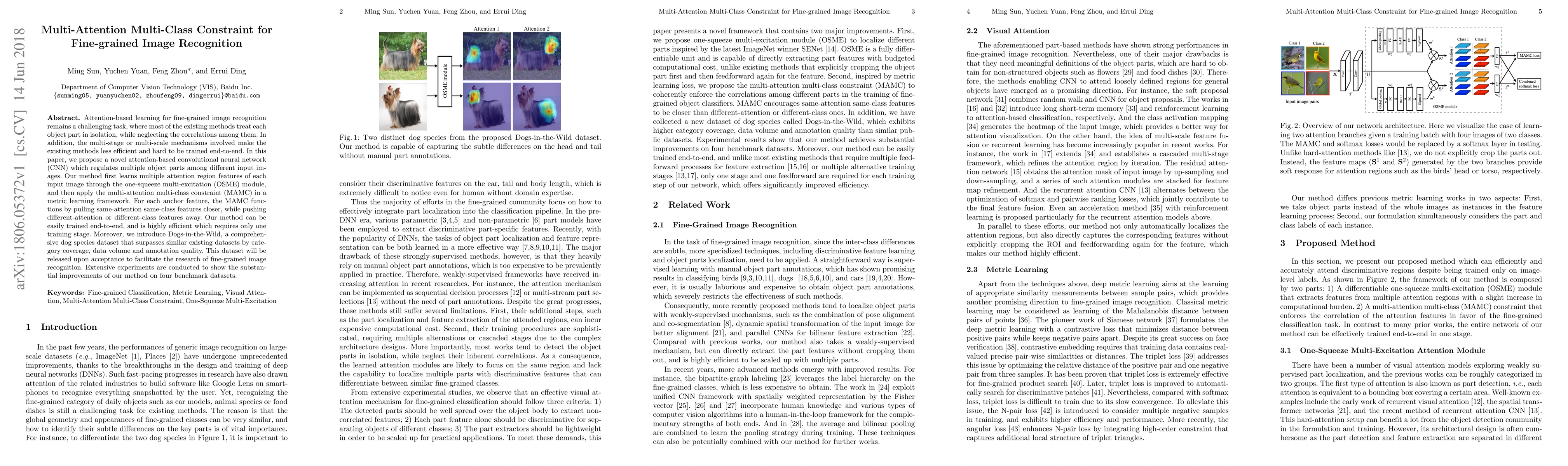 Attention-based learning for fine-grained image recognition remains a challenging task, where most of the existing methods treat each object part in isolation, while neglecting the correlations among them. In addition, the multi-stage or multi-scale mechanisms involved make the existing methods less efficient and hard to be trained end-to-end. In this paper, we propose a novel attention-based convolutional neural network (CNN) which regulates multiple object parts among different input images. Our method first learns multiple attention region features of each input image through the one-squeeze multi-excitation (OSME) module, and then apply the multi-attention multi-class constraint (MAMC) in a metric learning framework. For each anchor feature, the MAMC functions by pulling same-attention same-class features closer, while pushing different-attention or different-class features away. Our method can be easily trained end-to-end, and is highly efficient which requires only one training stage. Moreover, we introduce Dogs-in-the-Wild, a comprehensive dog species dataset that surpasses similar existing datasets by category coverage, data volume and annotation quality. This dataset will be released upon acceptance to facilitate the research of fine-grained image recognition. Extensive experiments are conducted to show the substantial improvements of our method on four benchmark datasets.