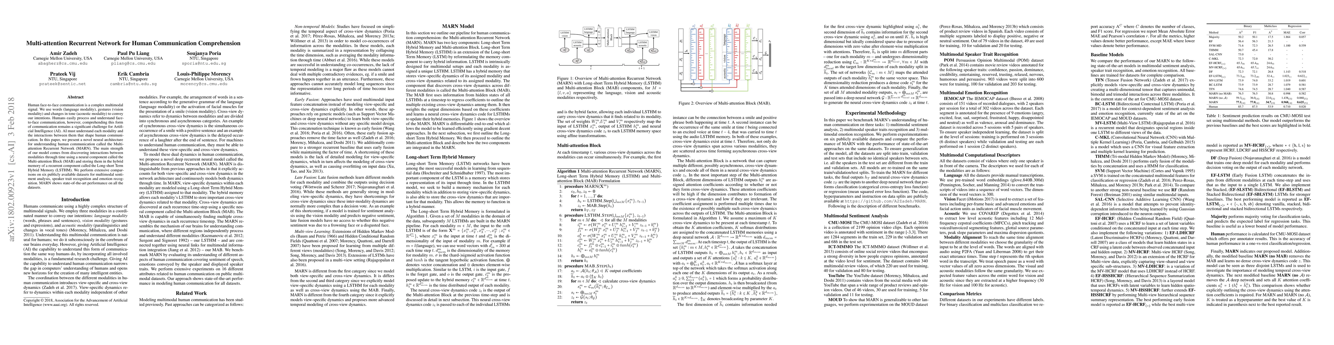This paper introduces the Multi-attention Recurrent Network (MARN) to comprehend complex human face-to-face communication, leveraging interactions between language, vision, and acoustic modalities. The model uses a Multi-attention Block and Long-short Term Hybrid Memory for superior performance, achieving state-of-the-art results in multimodal sentiment analysis, speaker trait recognition, and emotion recognition.