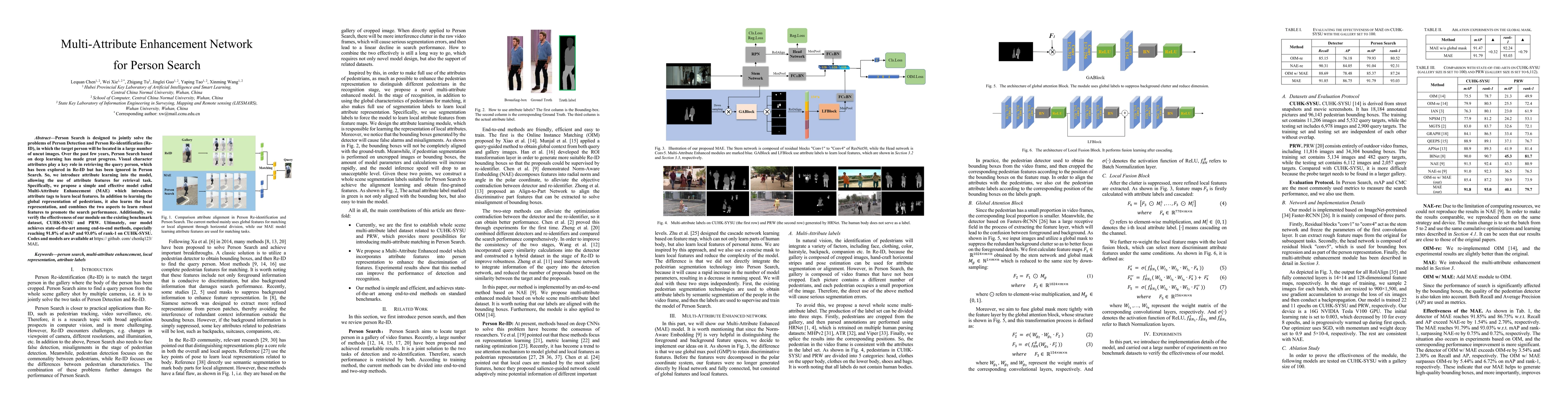 The paper proposes a Multi-Attribute Enhancement Network to improve Person Search by combining Person Detection and Person Re-identification, utilizing visual character attributes to enhance retrieval performance. The model achieves state-of-the-art results on benchmark datasets with 91.8% mAP and 93.0% rank-1 accuracy on CUHK-SYSU.