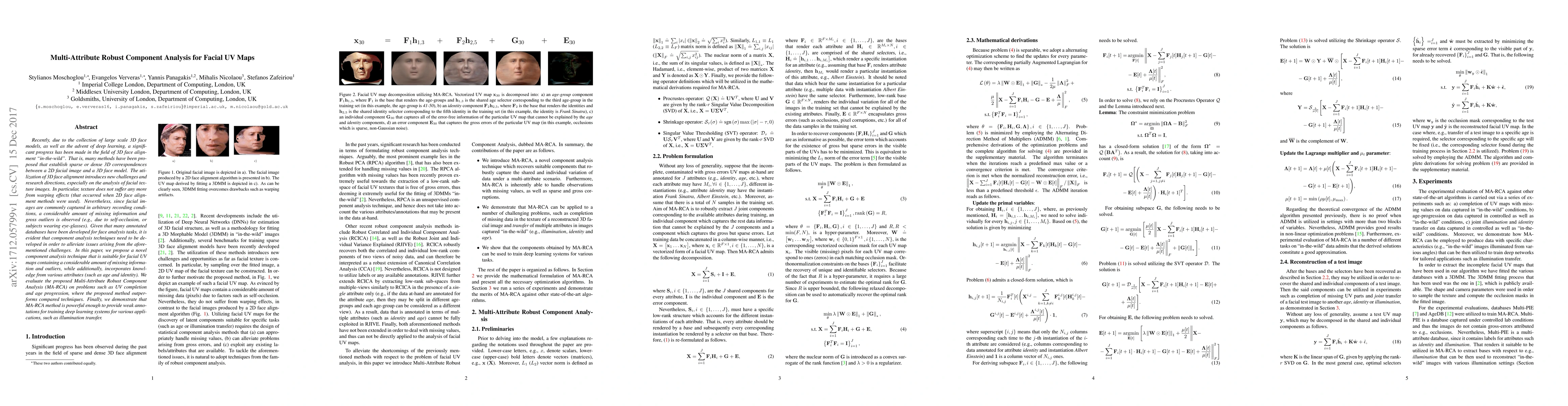 Recently, due to the collection of large scale 3D face models, as well as the advent of deep learning, a significant progress has been made in the field of 3D face alignment "in-the-wild". That is, many methods have been proposed that establish sparse or dense 3D correspondences between a 2D facial image and a 3D face model. The utilization of 3D face alignment introduces new challenges and research directions, especially on the analysis of facial texture images. In particular, texture does not suffer any more from warping effects (that occurred when 2D face alignment methods were used). Nevertheless, since facial images are commonly captured in arbitrary recording conditions, a considerable amount of missing information and gross outliers is observed (e.g., due to self-occlusion, or subjects wearing eye-glasses). Given that many annotated databases have been developed for face analysis tasks, it is evident that component analysis techniques need to be developed in order to alleviate issues arising from the aforementioned challenges. In this paper, we propose a novel component analysis technique that is suitable for facial UV maps containing a considerable amount of missing information and outliers, while additionally, incorporates knowledge from various attributes (such as age and identity). We evaluate the proposed Multi-Attribute Robust Component Analysis (MA-RCA) on problems such as UV completion and age progression, where the proposed method outperforms compared techniques. Finally, we demonstrate that MA-RCA method is powerful enough to provide weak annotations for training deep learning systems for various applications, such as illumination transfer.