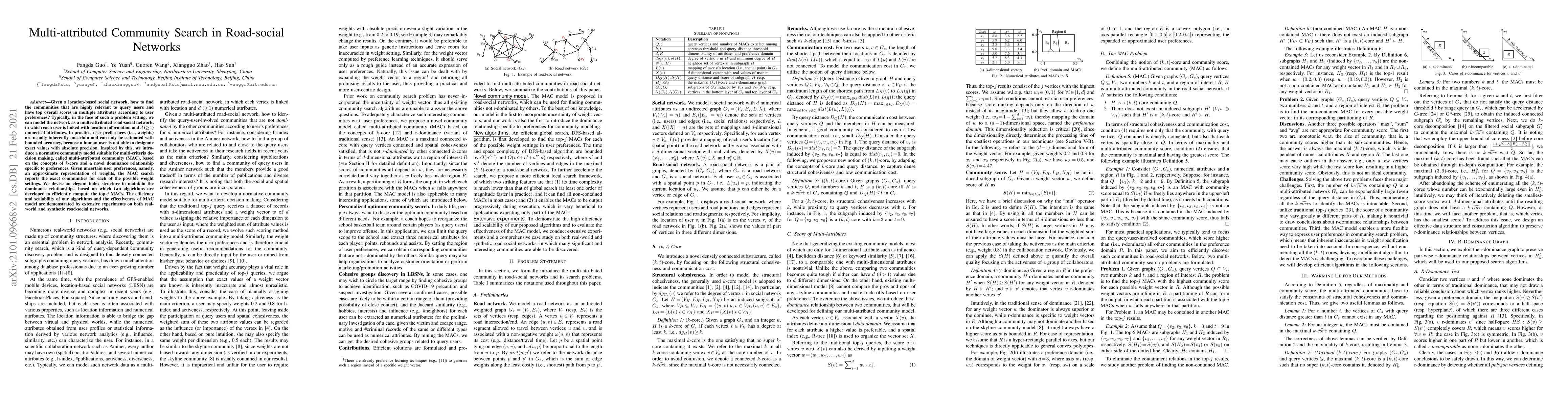Given a location-based social network, how to find the communities that are highly relevant to query users and have top overall scores in multiple attributes according to user preferences? Typically, in the face of such a problem setting, we can model the network as a multi-attributed road-social network, in which each user is linked with location information and $d$ ($\geq\! 1$) numerical attributes. In practice, user preferences (i.e., weights) are usually inherently uncertain and can only be estimated with bounded accuracy, because a human user is not able to designate exact values with absolute precision. Inspired by this, we introduce a normative community model suitable for multi-criteria decision making, called multi-attributed community (MAC), based on the concepts of $k$-core and a novel dominance relationship specific to preferences. Given uncertain user preferences, namely, an approximate representation of weights, the MAC search reports the exact communities for each of the possible weight settings. We devise an elegant index structure to maintain the dominance relationships, based on which two algorithms are developed to efficiently compute the top-$j$ MACs. The efficiency and scalability of our algorithms and the effectiveness of MAC model are demonstrated by extensive experiments on both real-world and synthetic road-social networks.