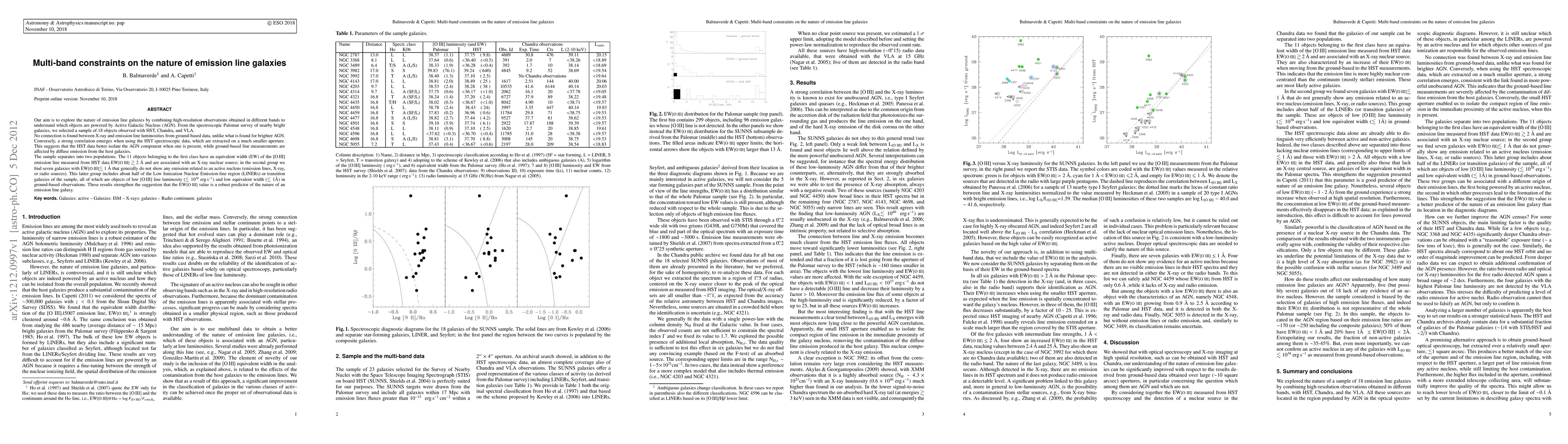 Our aim is to explore the nature of emission line galaxies by combining high-resolution observations obtained in different bands to understand which objects are powered by an Active Galactic Nucleus(AGN). From the spectroscopic Palomar survey of nearby bright galaxies, we selected a sample of 18 objects observed with HST, Chandra, and VLA. No connection is found between X-ray and emission line luminosities from ground-based data, unlike what is found for brighter AGN. Conversely, a strong correlation emerges when using the HST spectroscopic data, which are extracted on a much smaller aperture. This suggests that the HST data better isolate the AGN component when one is present, while ground-based line measurements are affected by diffuse emission from the host galaxies. The sample separates into two populations. The 11 objects belonging to the first class have an equivalent width of the [OIII] emission line measured from HST data EW([OIII])>~2 A and are associated with an X-ray nuclear source; in the second group we find seven galaxies with EW([OIII])<~1 A that generally do not show any emission related to an active nucleus (emission lines, X-ray, or radio sources). This latter group includes about half of the Low Ionization Nuclear Emission-line region (LINERs) or transition galaxies of the sample, all of which are objects of low [OIII] line luminosity (<~1E38 erg s-1) and low equivalent width (<~1 A) in ground-based observations. These results strengthen the suggestion that the EW([OIII]) value is a robust predictor of the nature of an emission line galaxy.