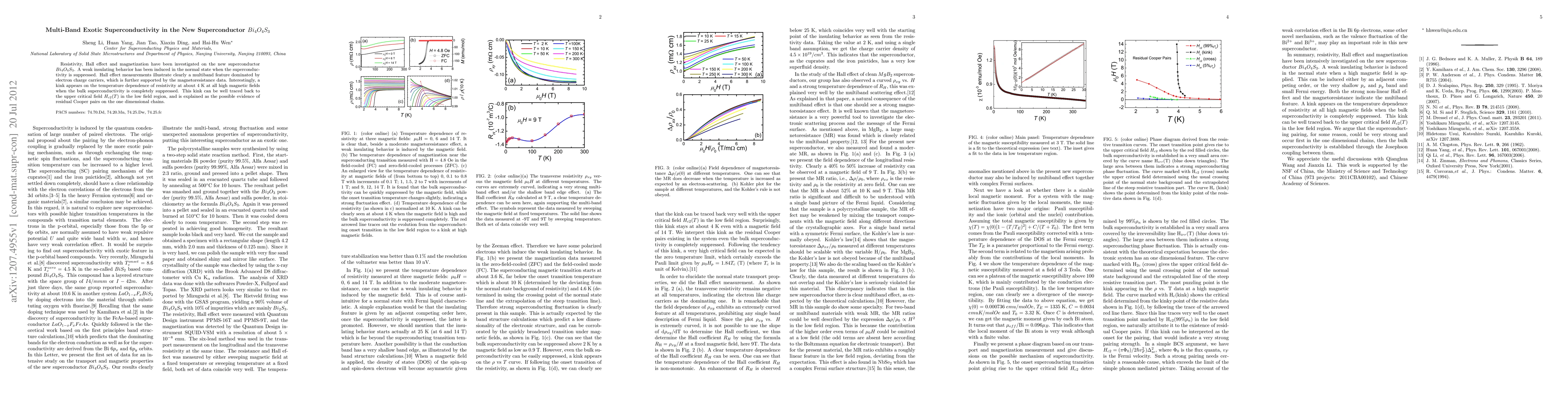 This study investigates the new superconductor Bi4O4S3, revealing a multiband superconductivity dominated by electron charge carriers. A notable kink in resistivity at 4 K suggests residual Cooper pairs on one-dimensional chains, indicating exotic superconductivity characteristics.