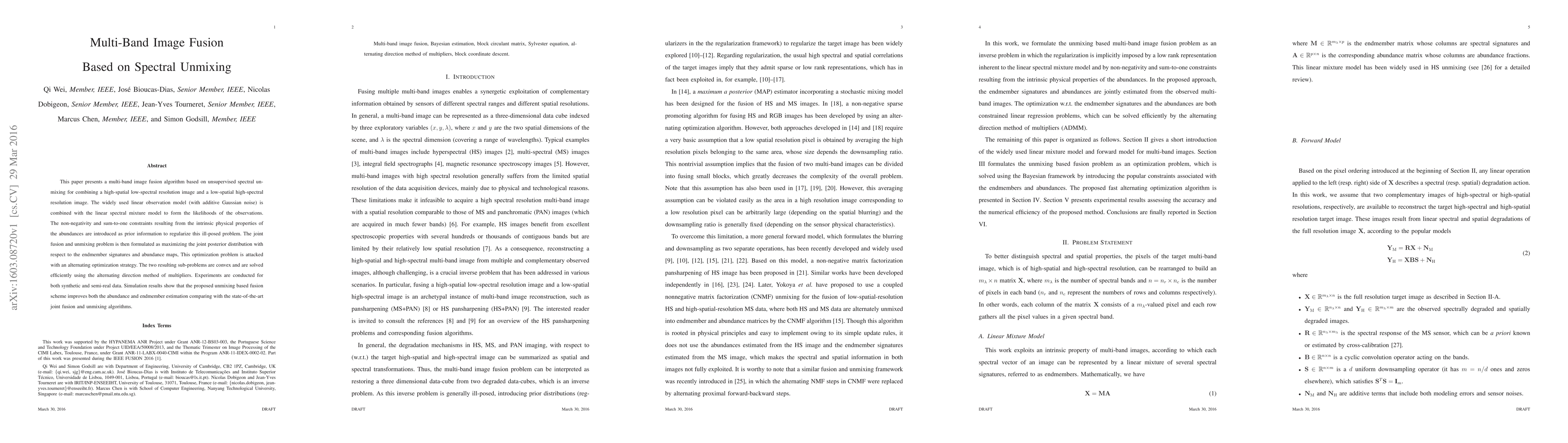 This paper proposes a multi-band image fusion algorithm using unsupervised spectral unmixing to combine high-spatial low-spectral resolution and low-spatial high-spectral resolution images. The method optimizes joint posterior distribution with an alternating optimization strategy, showing improved abundance and endmember estimation compared to state-of-the-art methods.