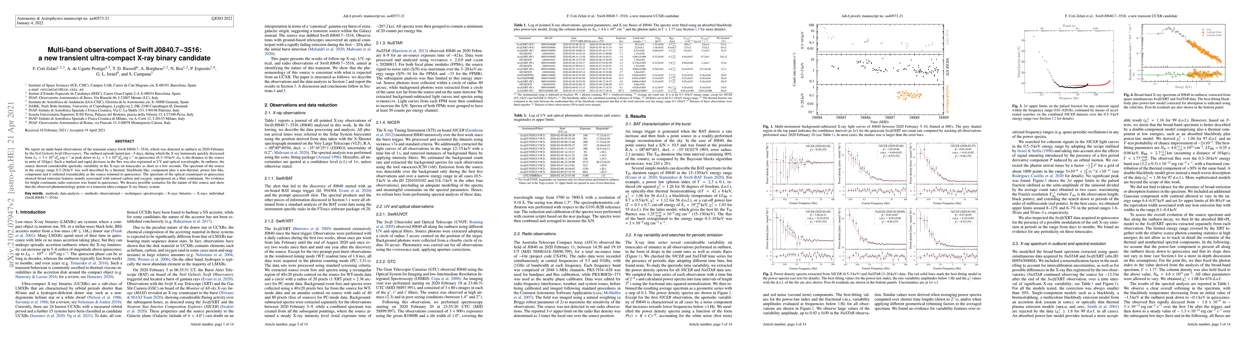 Swift J0840.7-3516, a transient ultra-compact X-ray binary candidate, exhibited a brief outburst in February 2020, characterized by rapid luminosity decline and aperiodic variability. The source's spectrum suggests a thermal blackbody plus a non-thermal component, with no significant radio emission in quiescence.