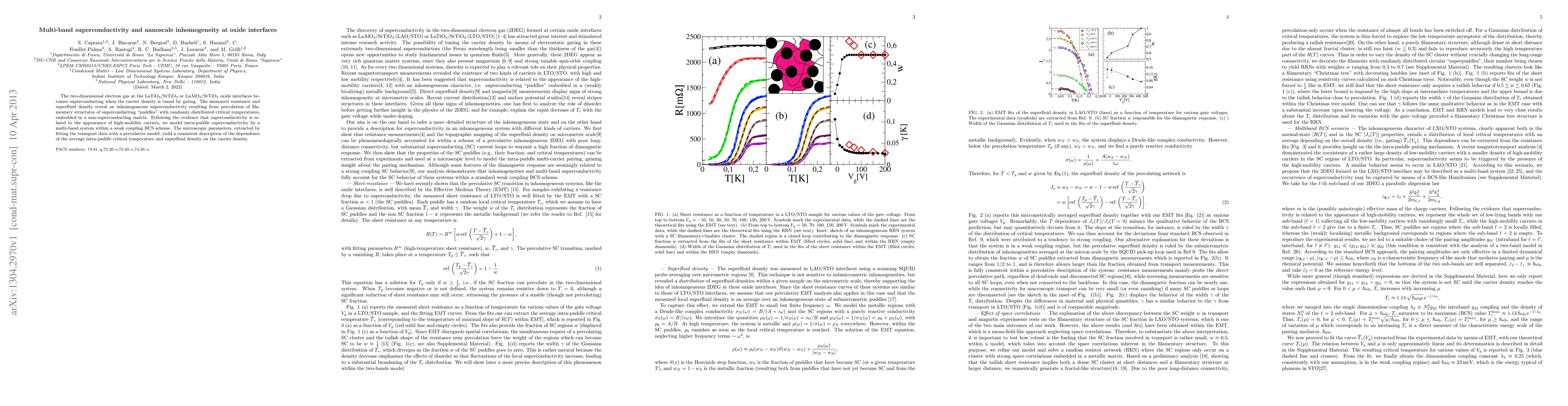 This paper investigates superconductivity in two-dimensional electron gases at oxide interfaces, revealing inhomogeneous superconductivity due to percolation of superconducting "puddles." The study models this phenomenon using a multi-band system within a weak coupling BCS framework, correlating superconductivity with high-mobility carriers.