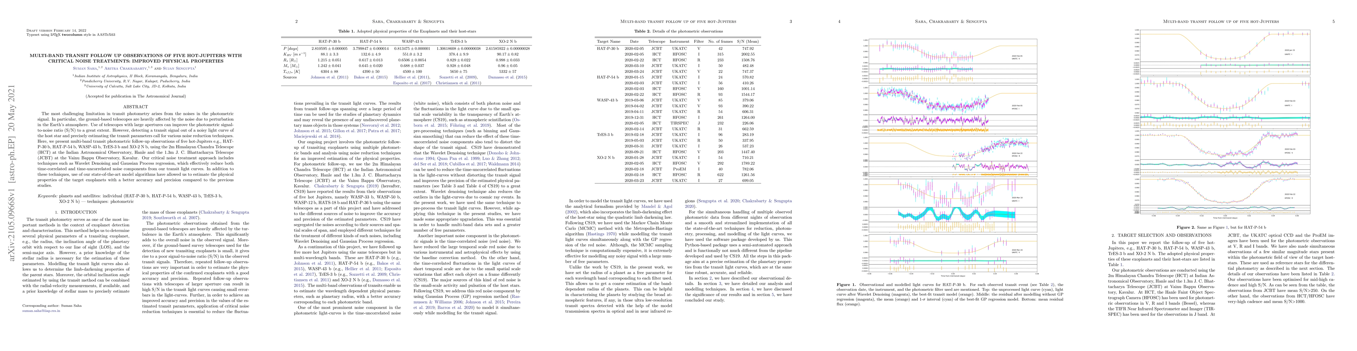 The most challenging limitation in transit photometry arises from the noises in the photometric signal. In particular, the ground-based telescopes are heavily affected by the noise due to perturbation in the Earth's atmosphere. Use of telescopes with large apertures can improve the photometric signal-to-noise ratio (S/N) to a great extent. However, detecting a transit signal out of a noisy light curve of the host star and precisely estimating the transit parameters call for various noise reduction techniques. Here, we present multi-band transit photometric follow-up observations of five hot-Jupiters e.g., HAT-P-30 b, HAT-P-54 b, WASP-43 b, TrES-3 b and XO-2 N b, using the 2m Himalayan Chandra Telescope (HCT) at the Indian Astronomical Observatory, Hanle and the 1.3m J. C. Bhattacharya Telescope (JCBT) at the Vainu Bappu Observatory, Kavalur. Our critical noise treatment approach includes techniques such as Wavelet Denoising and Gaussian Process regression, which effectively reduce both time-correlated and time-uncorrelated noise components from our transit light curves. In addition to these techniques, use of our state-of-the-art model algorithms have allowed us to estimate the physical properties of the target exoplanets with a better accuracy and precision compared to the previous studies.