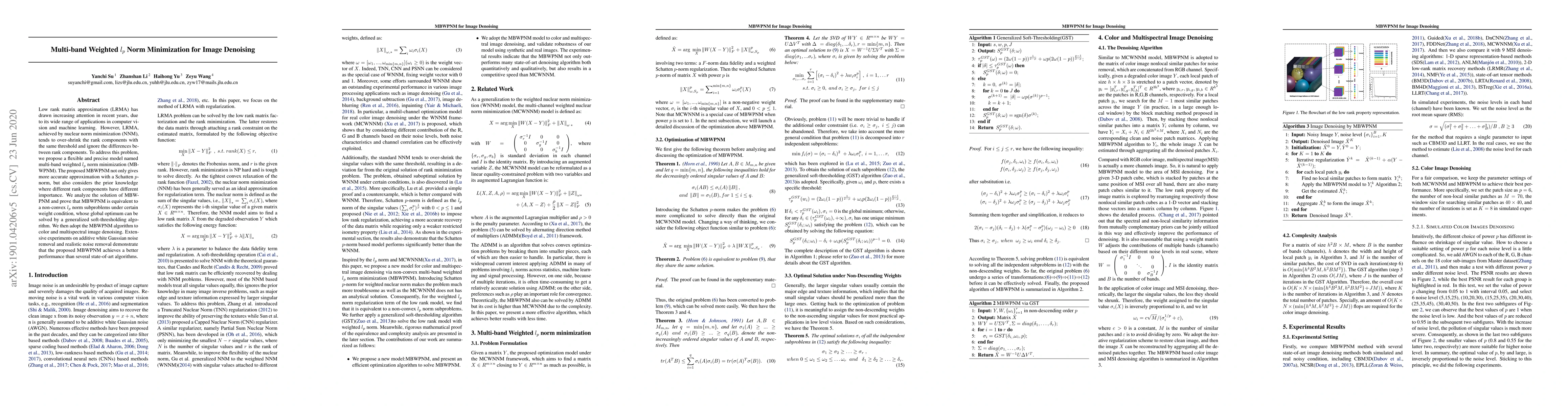 This paper proposes a multi-band weighted $l_p$ norm minimization (MBWPNM) model for improved image denoising by addressing the limitations of low rank matrix approximation. The MBWPNM algorithm achieves better performance than state-of-the-art methods in denoising color and multispectral images, as demonstrated through extensive experiments.