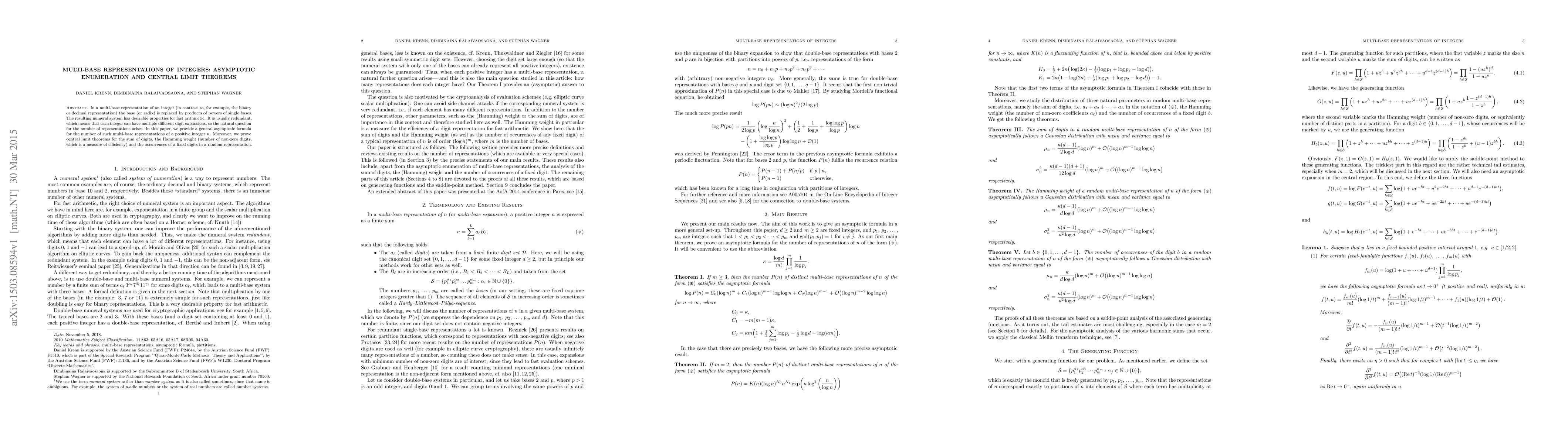 In a multi-base representation of an integer (in contrast to, for example, the binary or decimal representation) the base (or radix) is replaced by products of powers of single bases. The resulting numeral system has desirable properties for fast arithmetic. It is usually redundant, which means that each integer can have multiple different digit expansions, so the natural question for the number of representations arises. In this paper, we provide a general asymptotic formula for the number of such multi-base representations of a positive integer $n$. Moreover, we prove central limit theorems for the sum of digits, the Hamming weight (number of non-zero digits, which is a measure of efficiency) and the occurrences of a fixed digits in a random representation.