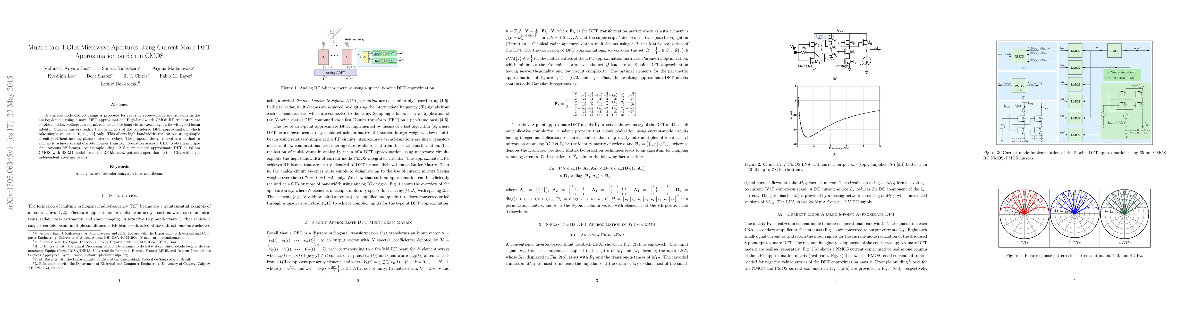 A current-mode CMOS design is proposed for realizing receive mode multi-beams in the analog domain using a novel DFT approximation. High-bandwidth CMOS RF transistors are employed in low-voltage current mirrors to achieve bandwidths exceeding 4 GHz with good beam fidelity. Current mirrors realize the coefficients of the considered DFT approximation, which take simple values in $\{0, \pm1, \pm2\}$ only. This allows high bandwidths realizations using simple circuitry without needing phase-shifters or delays. The proposed design is used as a method to efficiently achieve spatial discrete Fourier transform operation across a ULA to obtain multiple simultaneous RF beams. An example using 1.2 V current-mode approximate DFT on 65 nm CMOS, with BSIM4 models from the RF kit, show potential operation up to 4 GHz with eight independent aperture beams.