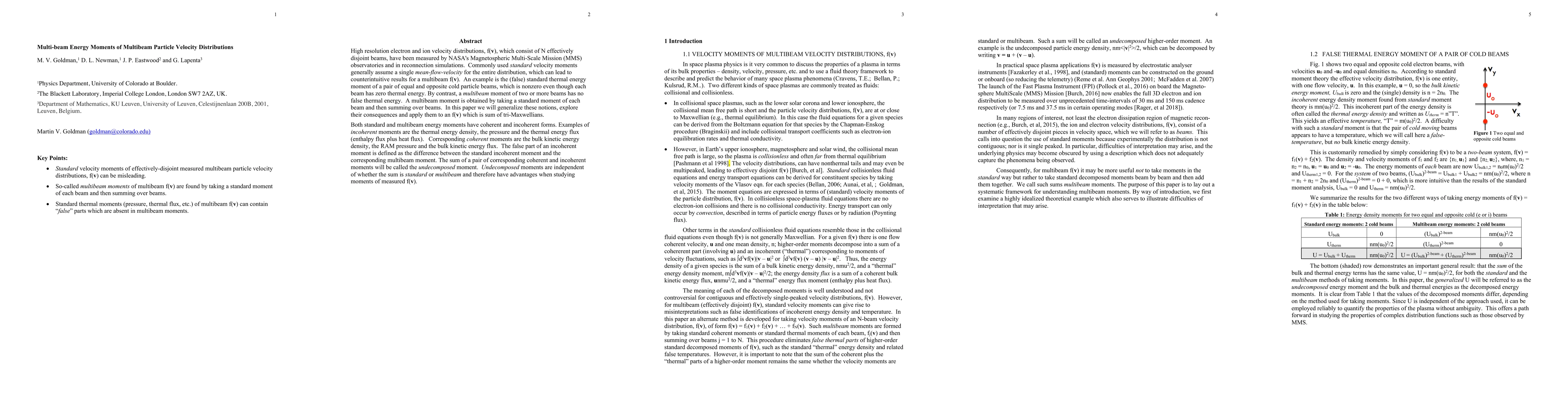 High resolution electron and ion velocity distributions, f(v), which consist of N effectively disjoint beams, have been measured by NASA's Magnetospheric Multi-Scale Mission (MMS) observatories and in reconnection simulations. Commonly used standard velocity moments generally assume a single mean-flow-velocity for the entire distribution, which can lead to counterintuitive results for a multibeam f(v). An example is the (false) standard thermal energy moment of a pair of equal and opposite cold particle beams, which is nonzero even though each beam has zero thermal energy. By contrast, a multibeam moment of two or more beams has no false thermal energy. A multibeam moment is obtained by taking a standard moment of each beam and then summing over beams. In this paper we will generalize these notions, explore their consequences and apply them to an f(v) which is sum of tri-Maxwellians. Both standard and multibeam energy moments have coherent and incoherent forms. Examples of incoherent moments are the thermal energy density, the pressure and the thermal energy flux (enthalpy flux plus heat flux). Corresponding coherent moments are the bulk kinetic energy density, the RAM pressure and the bulk kinetic energy flux. The false part of an incoherent moment is defined as the difference between the standard incoherent moment and the corresponding multibeam moment. The sum of a pair of corresponding coherent and incoherent moments will be called the undecomposed moment. Undecomposed moments are independent of whether the sum is standard or multibeam and therefore have advantages when studying moments of measured f(v).