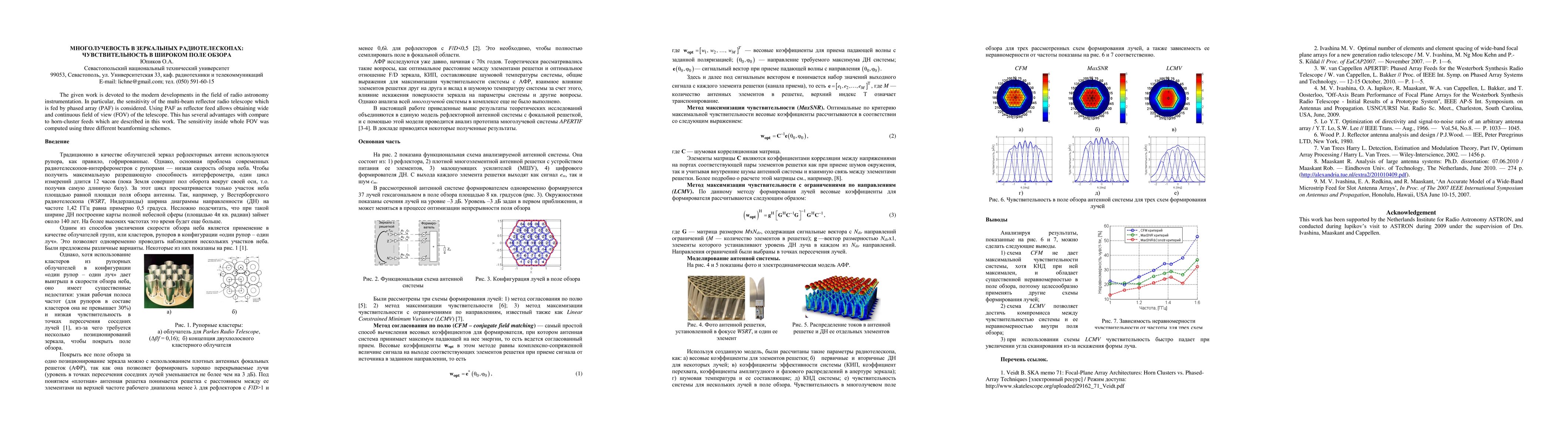 The given work is devoted to the modern developments in the field of radio astronomy instrumentation. In particular, the sensitivity of the multi-beam reflector radio telescope which is fed by phased array (PAF) is considered. Using PAF as reflector feed allows obtaining wide and continuous field of view (FOV) of the telescope. This has several advantages with compare to horn-cluster feeds which are described in this work. The sensitivity inside whole FOV was computed using three different beamforming schemes.