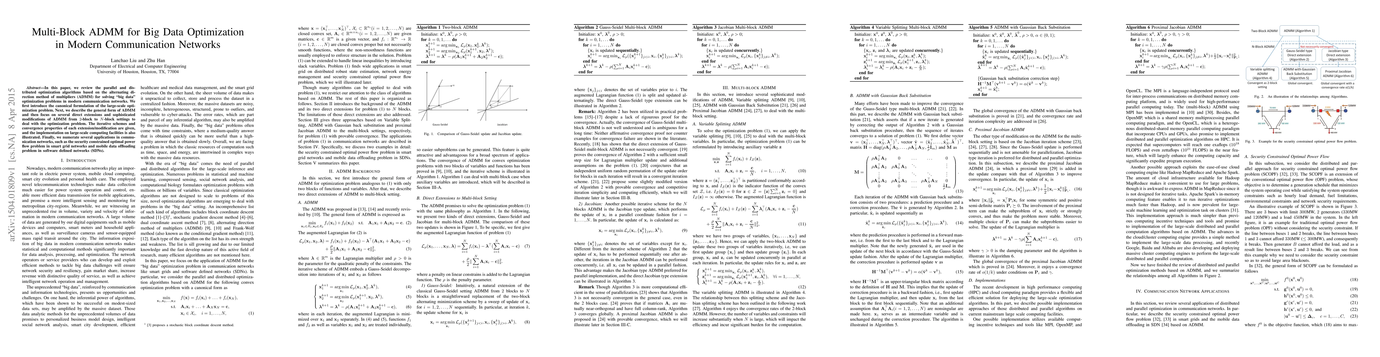 This paper reviews parallel and distributed optimization algorithms based on the ADMM for solving big data problems in modern communication networks, focusing on multi-block ADMM extensions for large-scale optimization. It discusses iterative schemes and convergence properties, and illustrates applications in smart grid networks and software-defined networks.