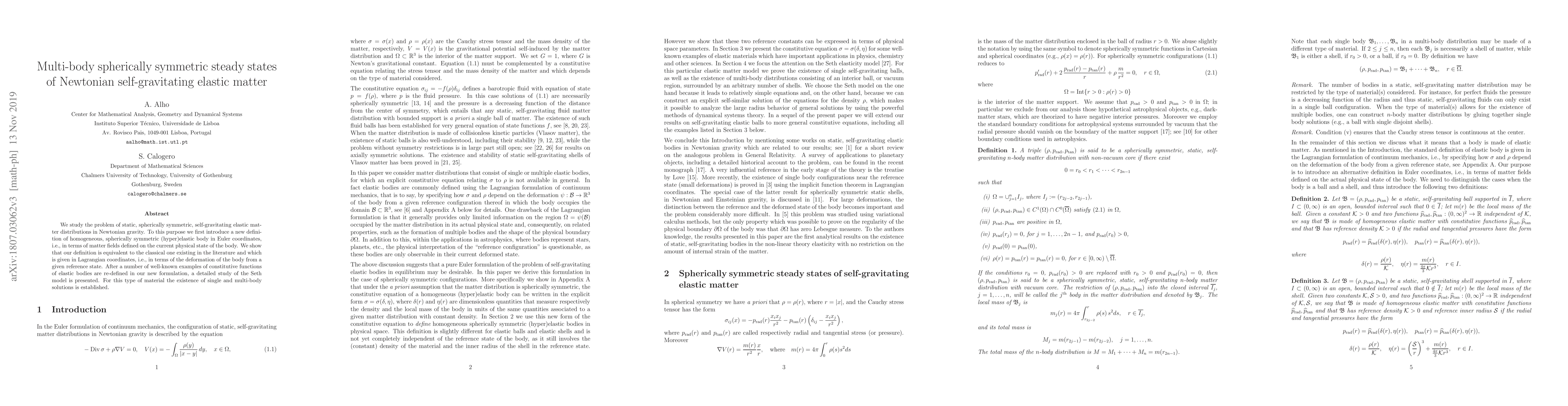 This paper investigates static, spherically symmetric, self-gravitating elastic matter distributions in Newtonian gravity, introducing a new Euler coordinate formulation for homogeneous, spherically symmetric (hyper)elastic bodies. The study establishes the existence of single and multi-body solutions for the Seth model within this framework.