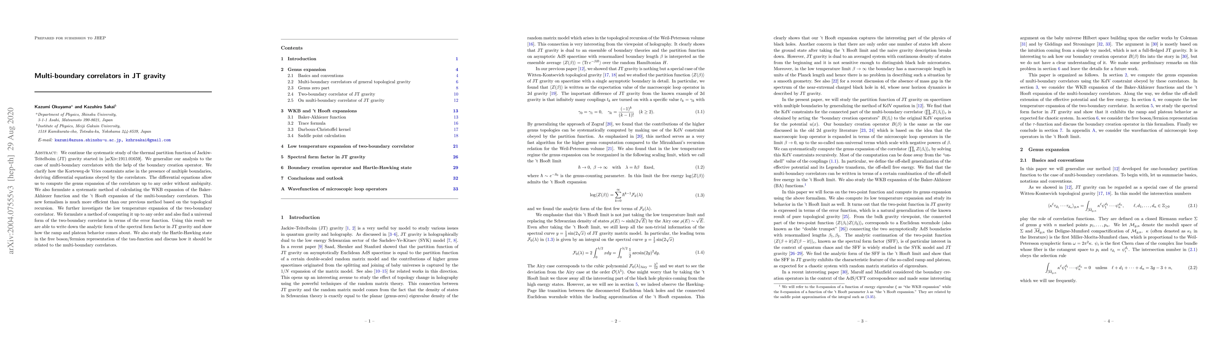This paper extends the study of JT gravity's thermal partition function to multi-boundary correlators, deriving differential equations for these correlators and establishing a new efficient method for calculating their WKB and 't Hooft expansions. It also investigates low temperature expansions and the spectral form factor, revealing the ramp and plateau behavior.