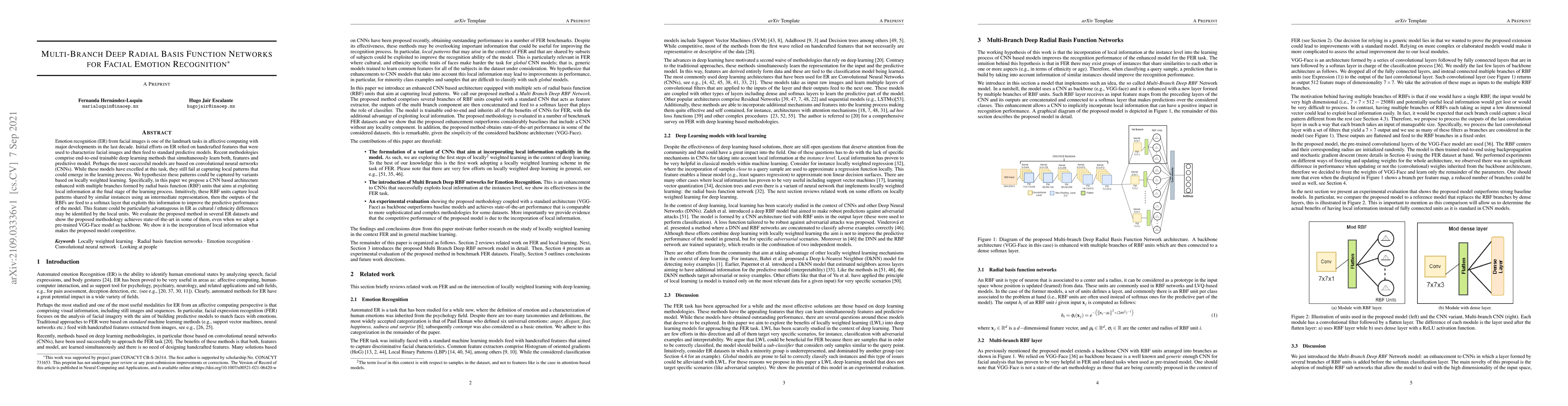 Emotion recognition (ER) from facial images is one of the landmark tasks in affective computing with major developments in the last decade. Initial efforts on ER relied on handcrafted features that were used to characterize facial images and then feed to standard predictive models. Recent methodologies comprise end-to-end trainable deep learning methods that simultaneously learn both, features and predictive model. Perhaps the most successful models are based on convolutional neural networks (CNNs). While these models have excelled at this task, they still fail at capturing local patterns that could emerge in the learning process. We hypothesize these patterns could be captured by variants based on locally weighted learning. Specifically, in this paper we propose a CNN based architecture enhanced with multiple branches formed by radial basis function (RBF) units that aims at exploiting local information at the final stage of the learning process. Intuitively, these RBF units capture local patterns shared by similar instances using an intermediate representation, then the outputs of the RBFs are feed to a softmax layer that exploits this information to improve the predictive performance of the model. This feature could be particularly advantageous in ER as cultural / ethnicity differences may be identified by the local units. We evaluate the proposed method in several ER datasets and show the proposed methodology achieves state-of-the-art in some of them, even when we adopt a pre-trained VGG-Face model as backbone. We show it is the incorporation of local information what makes the proposed model competitive.