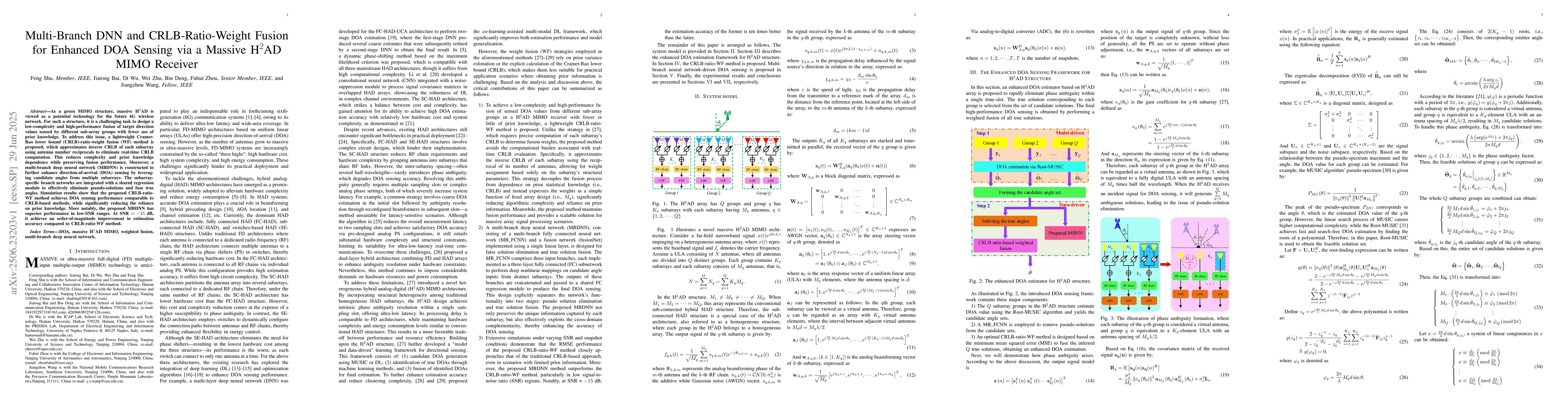 As a green MIMO structure, massive H$^2$AD is viewed as a potential technology for the future 6G wireless network. For such a structure, it is a challenging task to design a low-complexity and high-performance fusion of target direction values sensed by different sub-array groups with fewer use of prior knowledge. To address this issue, a lightweight Cramer-Rao lower bound (CRLB)-ratio-weight fusion (WF) method is proposed, which approximates inverse CRLB of each subarray using antenna number reciprocals to eliminate real-time CRLB computation. This reduces complexity and prior knowledge dependence while preserving fusion performance. Moreover, a multi-branch deep neural network (MBDNN) is constructed to further enhance direction-of-arrival (DOA) sensing by leveraging candidate angles from multiple subarrays. The subarray-specific branch networks are integrated with a shared regression module to effectively eliminate pseudo-solutions and fuse true angles. Simulation results show that the proposed CRLB-ratio-WF method achieves DOA sensing performance comparable to CRLB-based methods, while significantly reducing the reliance on prior knowledge. More notably, the proposed MBDNN has superior performance in low-SNR ranges. At SNR $= -15$ dB, it achieves an order-of-magnitude improvement in estimation accuracy compared to CRLB-ratio-WF method.