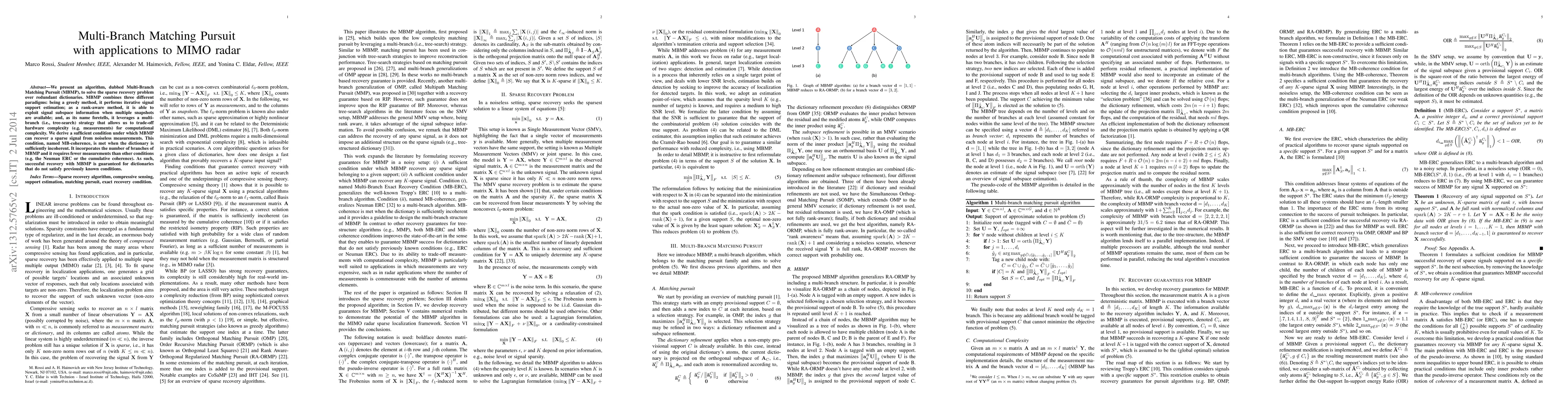 The Multi-Branch Matching Pursuit (MBMP) algorithm addresses the sparse recovery problem using a combination of greedy, rank-aware, and multi-branch strategies, offering a trade-off between hardware and computational complexity. It guarantees successful sparse signal recovery under a new condition called MB-coherence, which requires fewer measurements than previous methods.