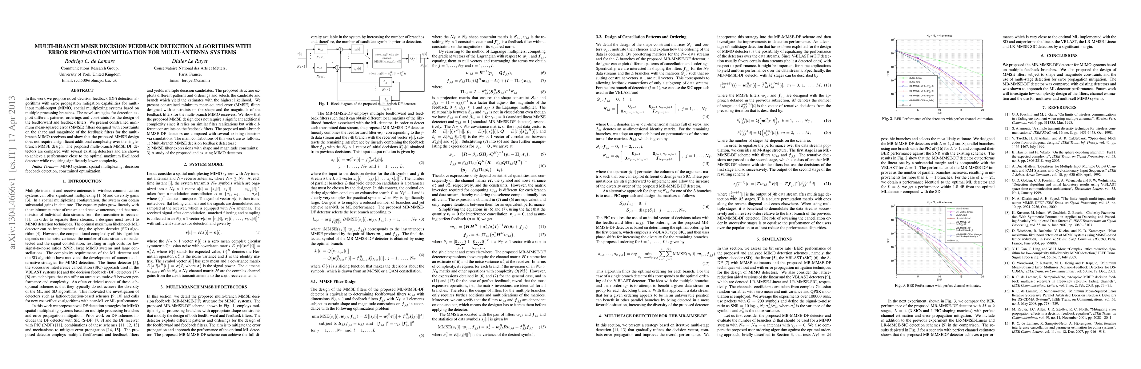 This paper introduces new multi-branch decision feedback detection algorithms for MIMO systems that mitigate error propagation. The proposed constrained minimum mean-squared error filters enhance the performance of multi-branch MIMO receivers with comparable complexity to single-branch designs, achieving near-optimal performance with lower complexity.