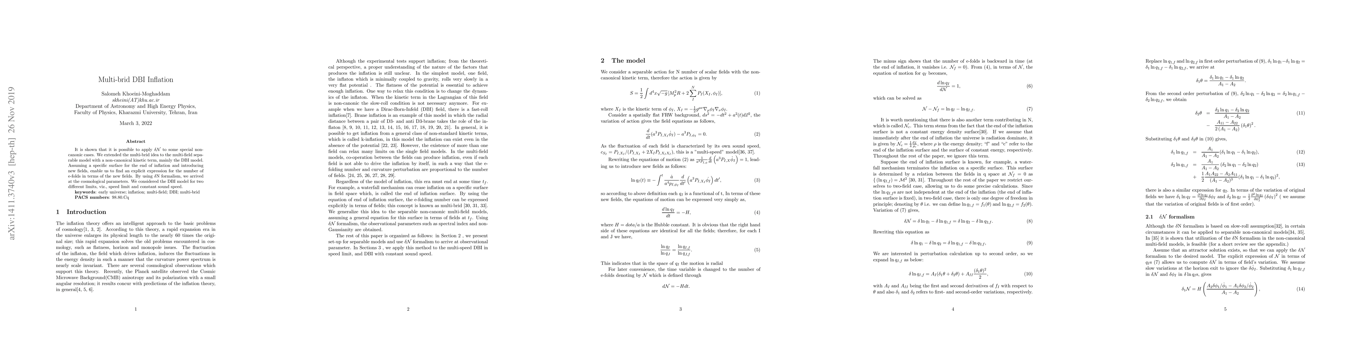 It is shown that it is possible to apply $\delta \cN$ to some special non-canonic cases. We extended the multi-brid idea to the multi-field separable model with a non-canonical kinetic term, mainly the DBI model. Assuming a specific surface for the end of inflation and introducing new fields, enable us to find an explicit expression for the number of e-folds in terms of the new fields. By using $\delta$N formalism, we arrived at the cosmological parameters. We considered the DBI model for two different limits, viz., speed limit and constant sound speed.