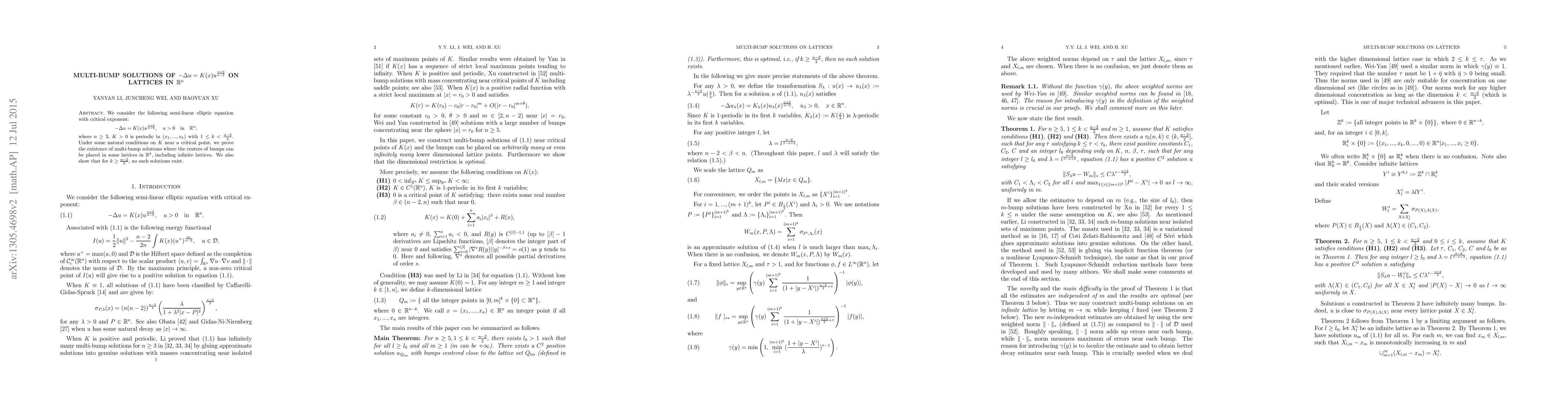 We consider critical exponent semi-linear elliptic equation with coefficient K(x) periodic in its first k variables, with 2k smaller than n-2. Under some natural conditions on K near a critical point, we prove the existence of multi-bump solutions where the centers of bumps can be placed in some lattices in Rk, including infinite lattices. We also show that for 2k greater than or equal to n-2, no such solutions exist.
