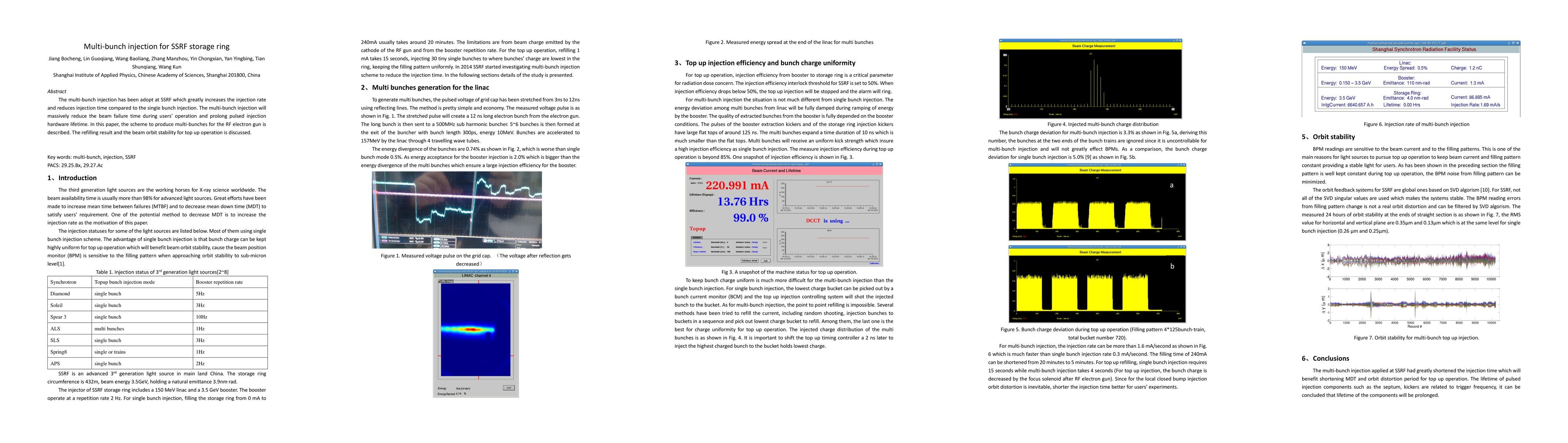 This paper describes the implementation of multi-bunch injection at SSRF, which significantly boosts injection rate and reduces time compared to single bunch injection, thereby minimizing beam failure and extending hardware longevity. The study details the RF electron gun scheme and discusses refilling results and beam orbit stability during top-up operations.