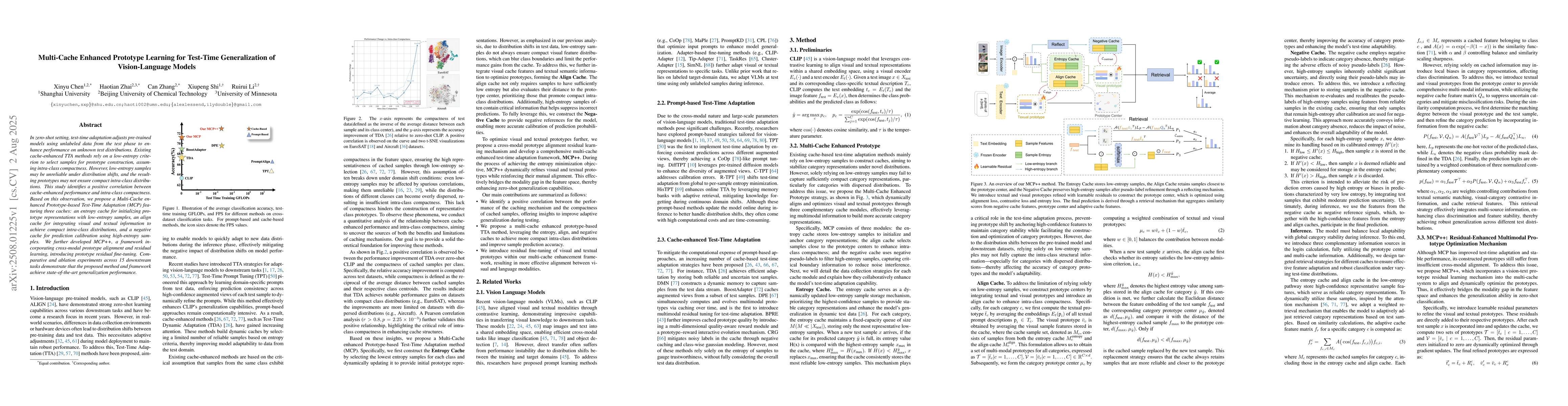 In zero-shot setting, test-time adaptation adjusts pre-trained models using unlabeled data from the test phase to enhance performance on unknown test distributions. Existing cache-enhanced TTA methods rely on a low-entropy criterion to select samples for prototype construction, assuming intra-class compactness. However, low-entropy samples may be unreliable under distribution shifts, and the resulting prototypes may not ensure compact intra-class distributions. This study identifies a positive correlation between cache-enhanced performance and intra-class compactness. Based on this observation, we propose a Multi-Cache enhanced Prototype-based Test-Time Adaptation (MCP) featuring three caches: an entropy cache for initializing prototype representations with low-entropy samples, an align cache for integrating visual and textual information to achieve compact intra-class distributions, and a negative cache for prediction calibration using high-entropy samples. We further developed MCP++, a framework incorporating cross-modal prototype alignment and residual learning, introducing prototype residual fine-tuning. Comparative and ablation experiments across 15 downstream tasks demonstrate that the proposed method and framework achieve state-of-the-art generalization performance.